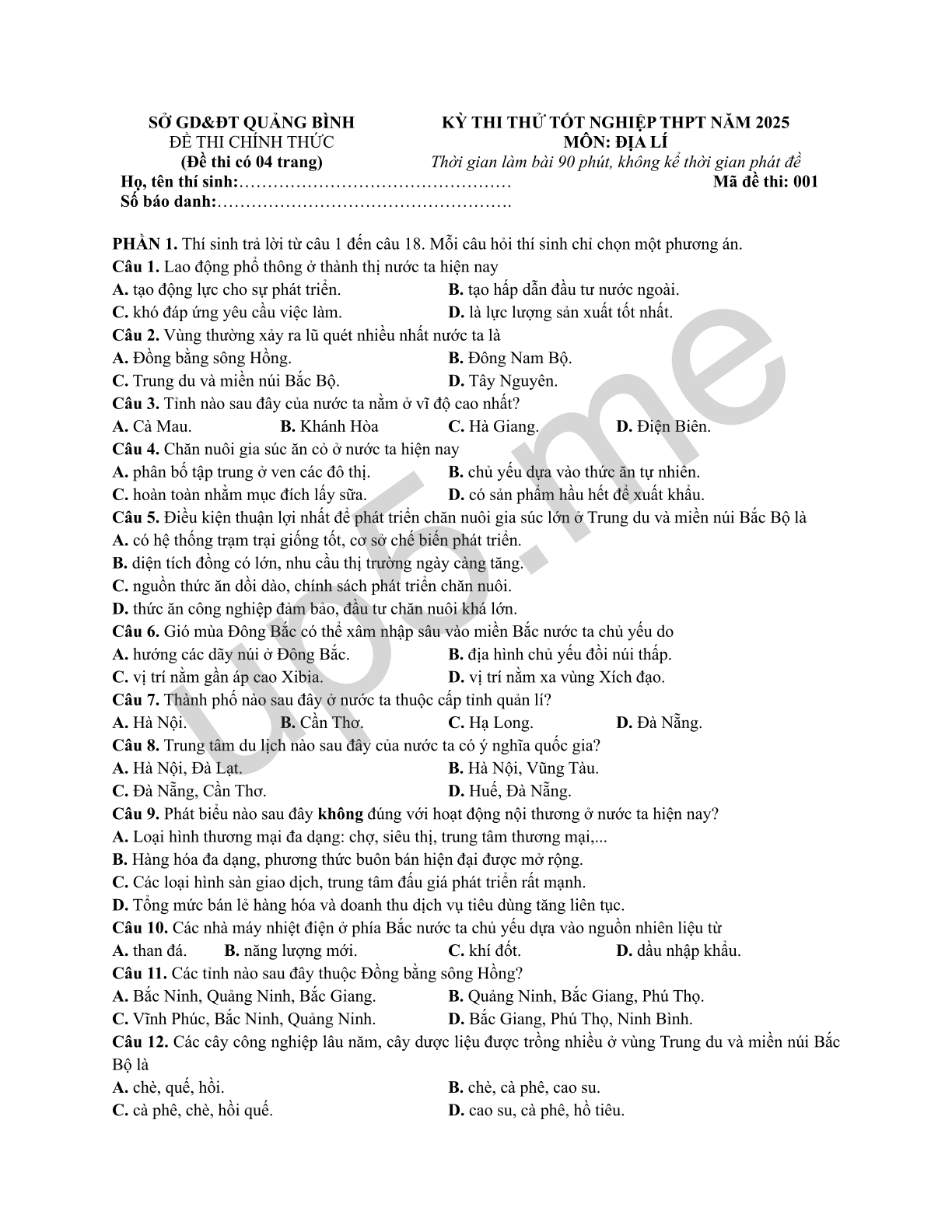 | SỞ GD&ĐT QUẢNG BÌNHĐỀ THI CHÍNH THỨC(Đề thi có 04 trang) | KỲ THI THỬ TỐT NGHIỆP THPT NĂM 2025MÔN: ĐỊA LÍThời gian làm bài 90 phút, không kể thời gian phát đề | |
