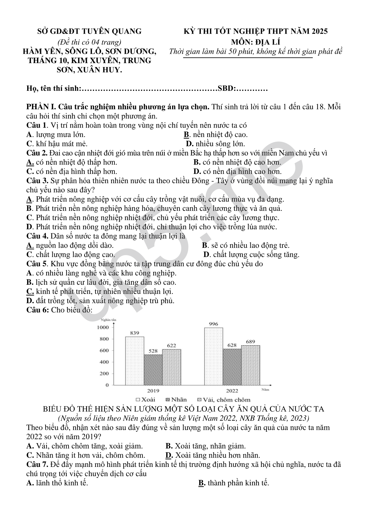 MÔN: ĐỊA LÍ Thời gian làm bài 50 phút, không kể thời gian phát đề |