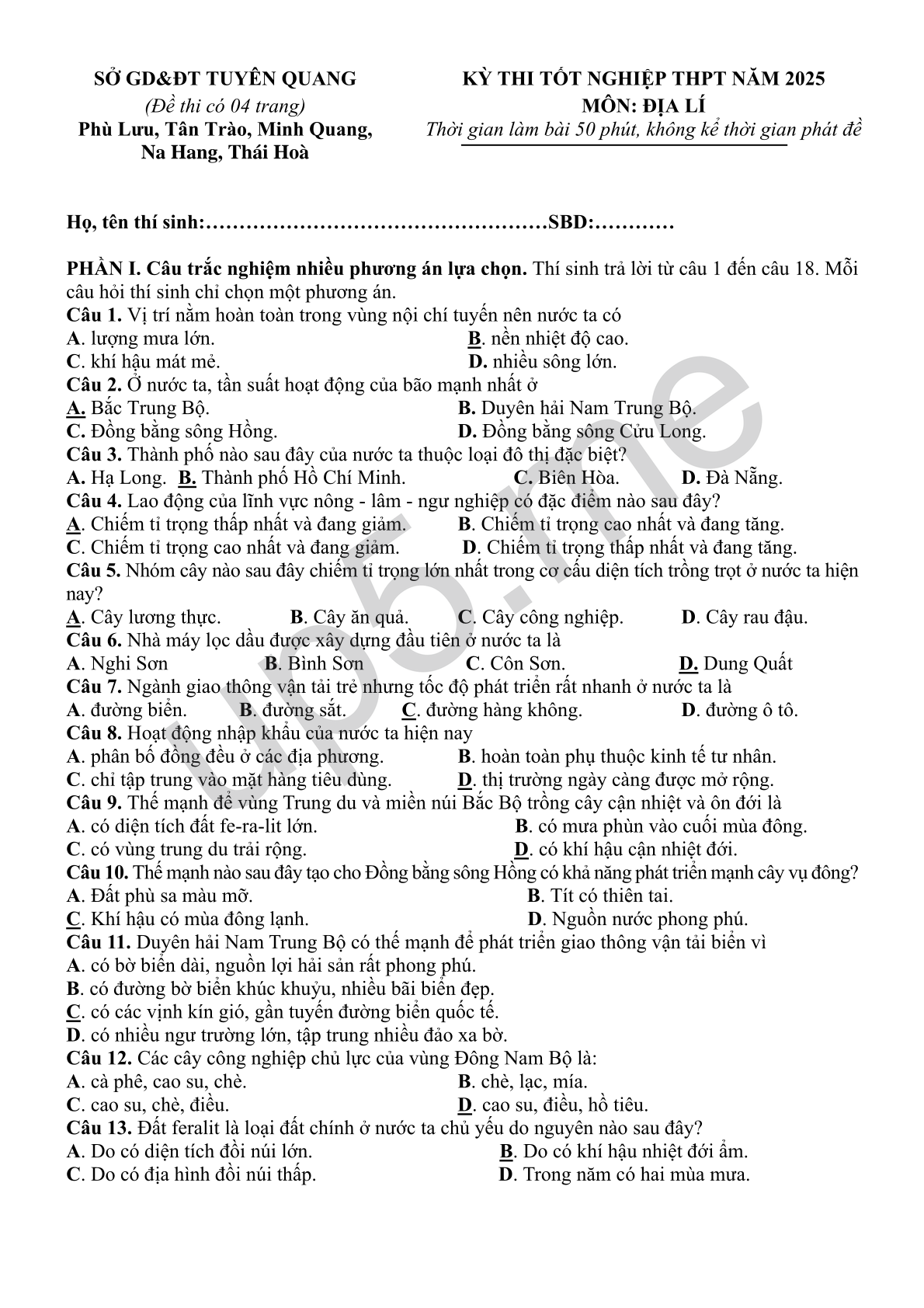 | SỞ GD&ĐT TUYÊN QUANG | KỲ THI TỐT NGHIỆP THPT NĂM 2025 |