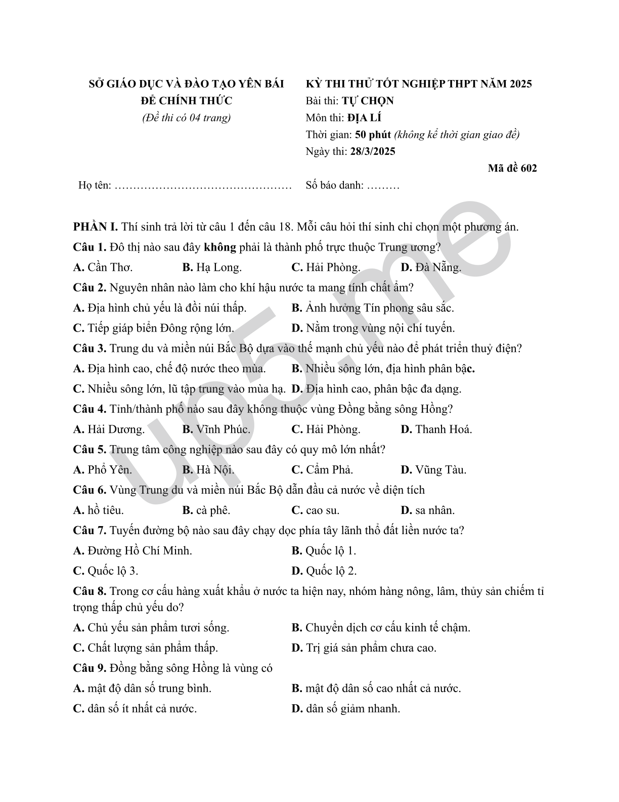 | SỞ GIÁO DỤC VÀ ĐÀO TẠO YÊN BÁIĐỂ CHÍNH THỨC(Đề thi có 04 trang | KỲ THI THỬ TỐT NGHIỆP THPT NĂM 2025Bài thi: TỰ CHỌNMôn thi: ĐỊA LÍThời gian: 50 phút (không kể thời gian giao đề)Ngày thi: 28/3/2025 Mã đề 602 |