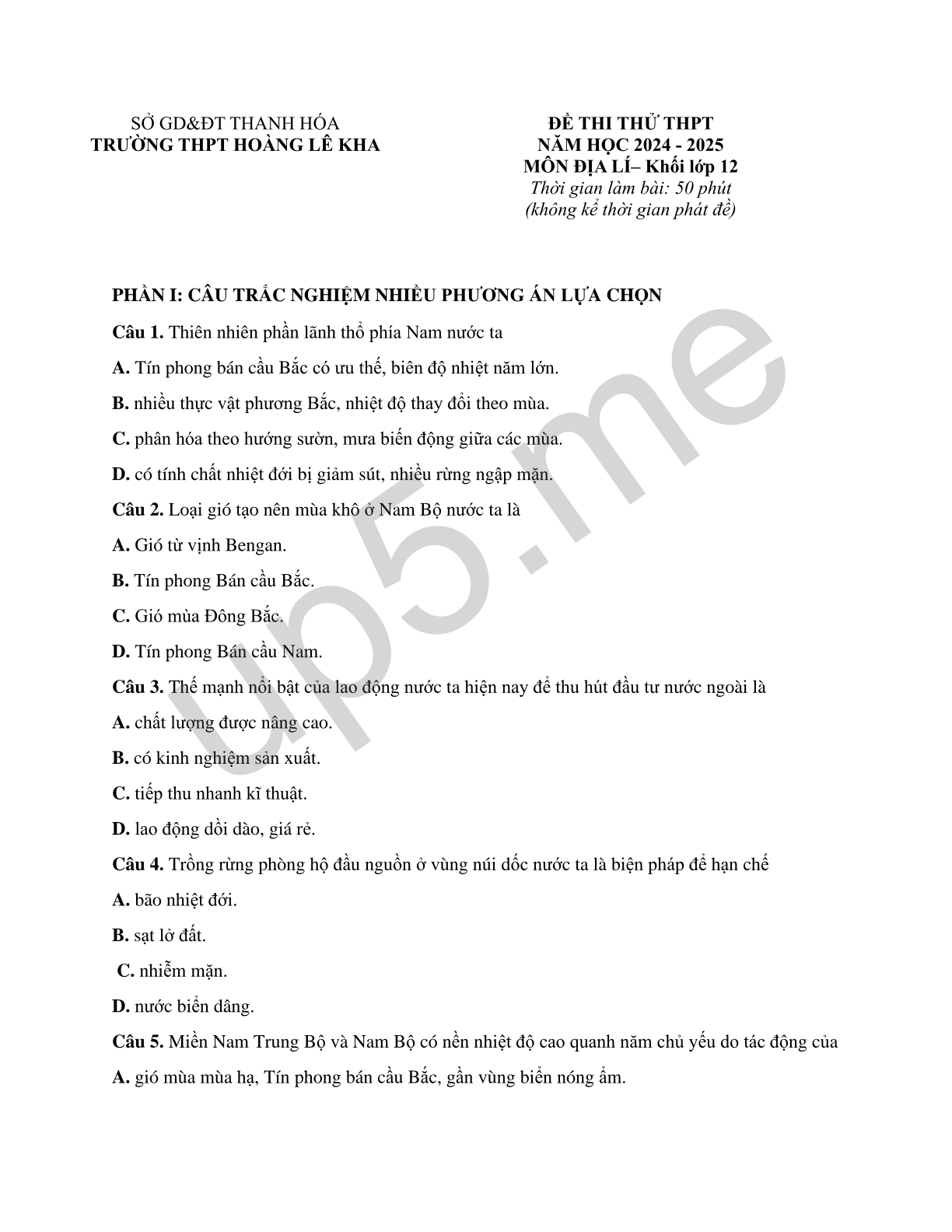 ĐỀ THI THỬ THPT NĂM HỌC 2024 - 2025 MÔN ĐỊA LÍ– Khối lớp 12 Thời gian làm bài: 50 phút (không kể thời gian phát đề) |