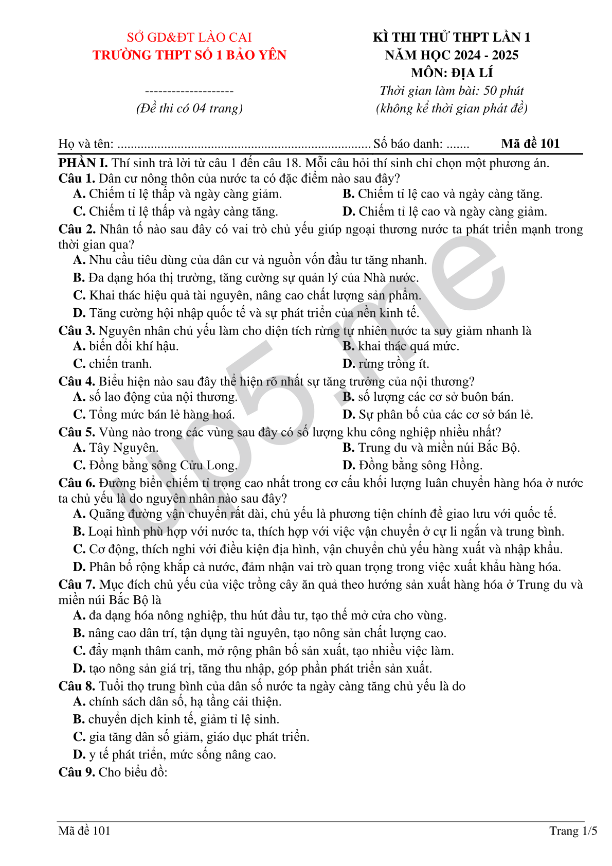 | Họ và tên: ............................................................................ | Số báo danh: ....... | Mã đề 101 |