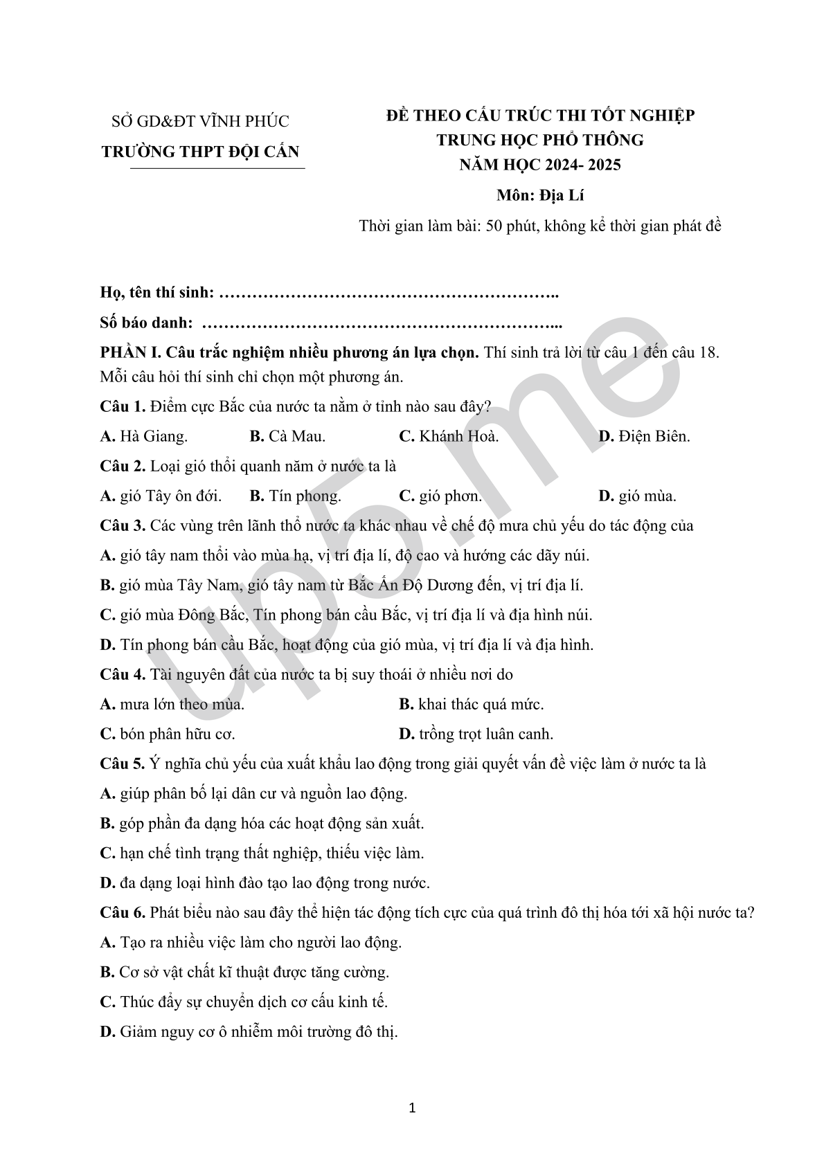 ĐỀ THEO CẤU TRÚC THI TỐT NGHIỆP TRUNG HỌC PHỔ THÔNG NĂM HỌC 2024- 2025 Môn: Địa LíThời gian làm bài: 50 phút, không kể thời gian phát đề |