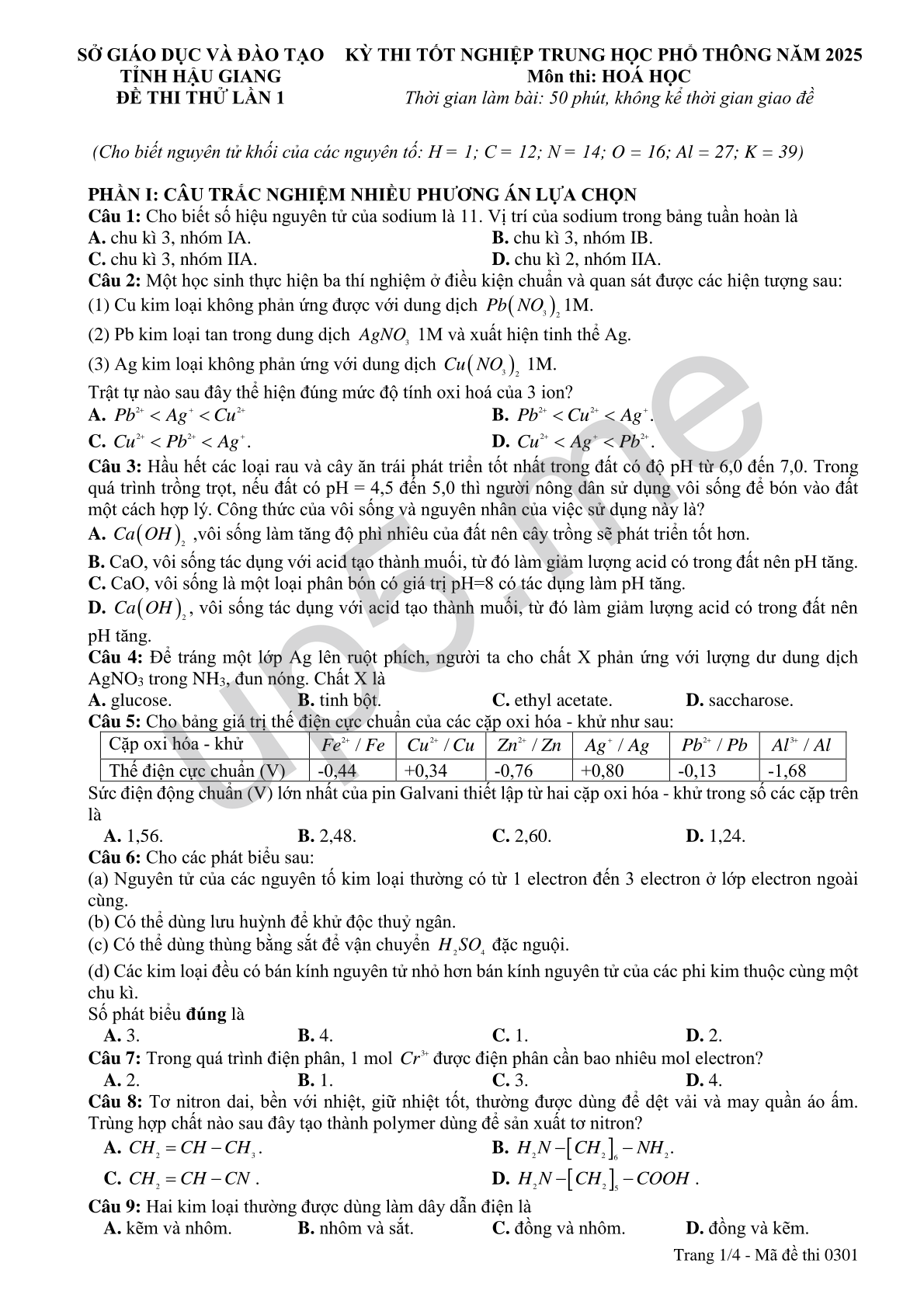 | SỞ GIÁO DỤC VÀ ĐÀO TẠOTỈNH HẬU GIANGĐỀ THI THỬ LẦN 1 | KỲ THI TỐT NGHIỆP TRUNG HỌC PHỔ THÔNG NĂM 2025 Môn thi: HOÁ HỌCThời gian làm bài: 50 phút, không kể thời gian giao đề |