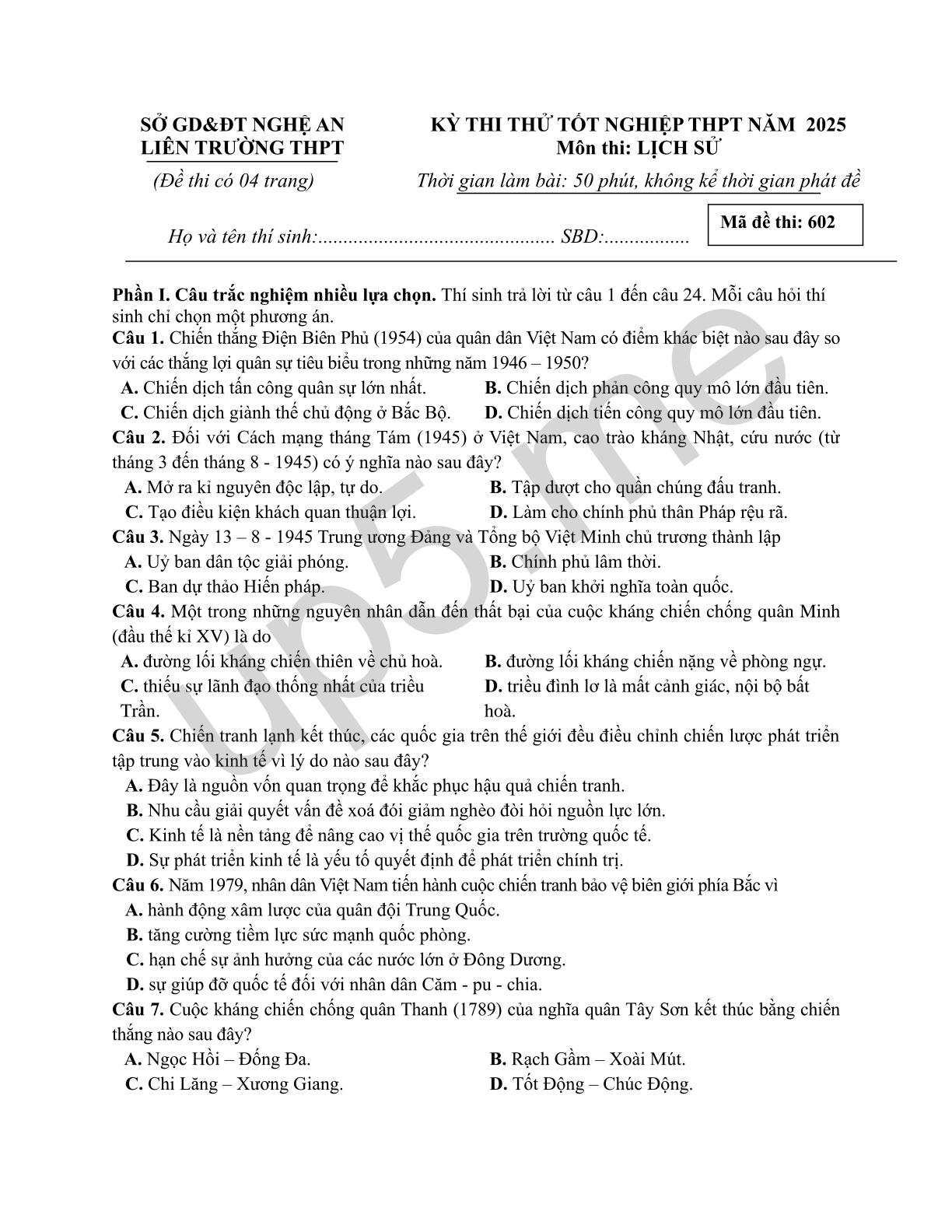 | SỞ GD&ĐT NGHỆ ANLIÊN TRƯỜNG THPT | KỲ THI THỬ TỐT NGHIỆP THPT NĂM 2025Môn thi: LỊCH SỬ |