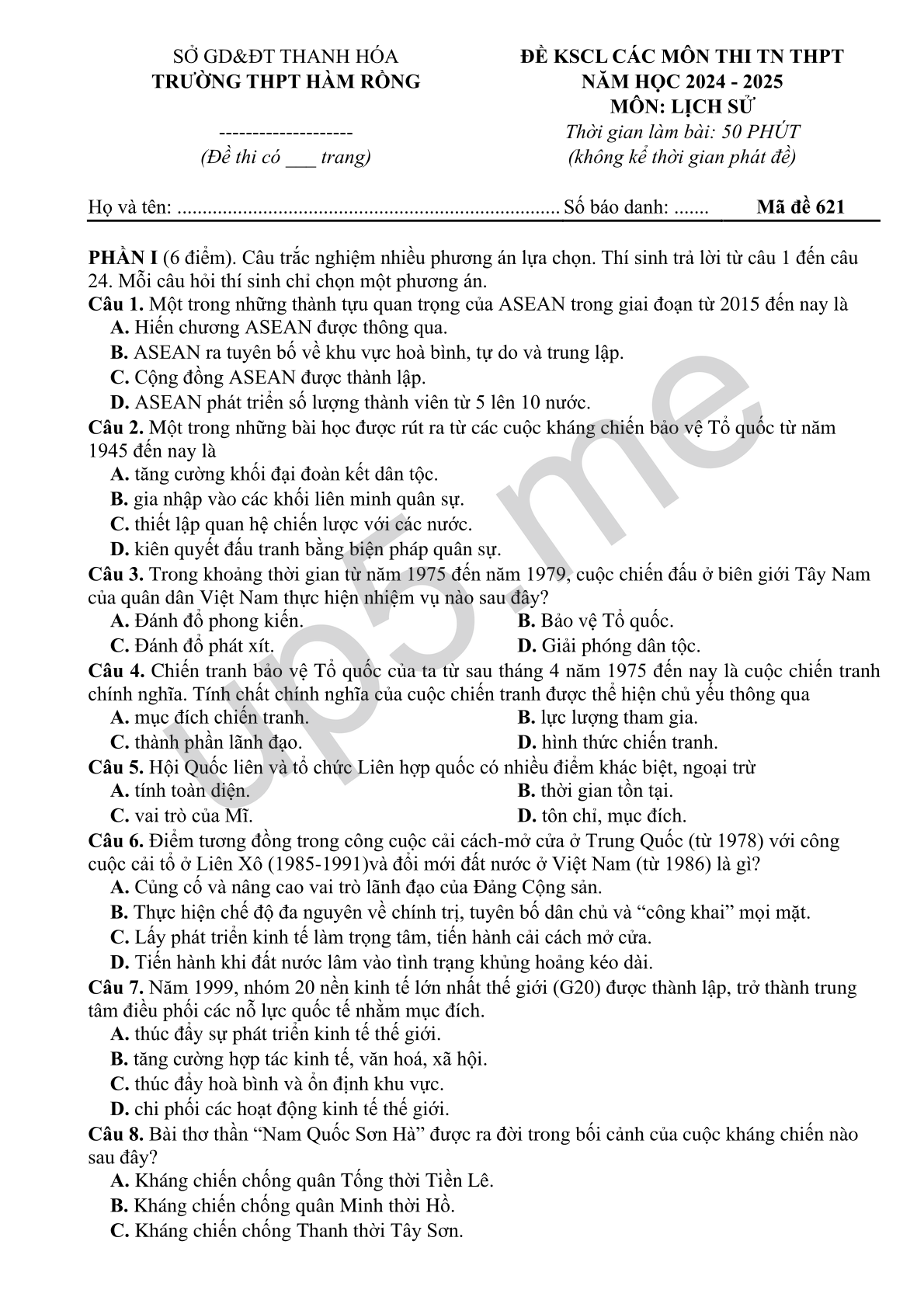 | Họ và tên: ............................................................................ | Số báo danh: ....... | Mã đề 621 |