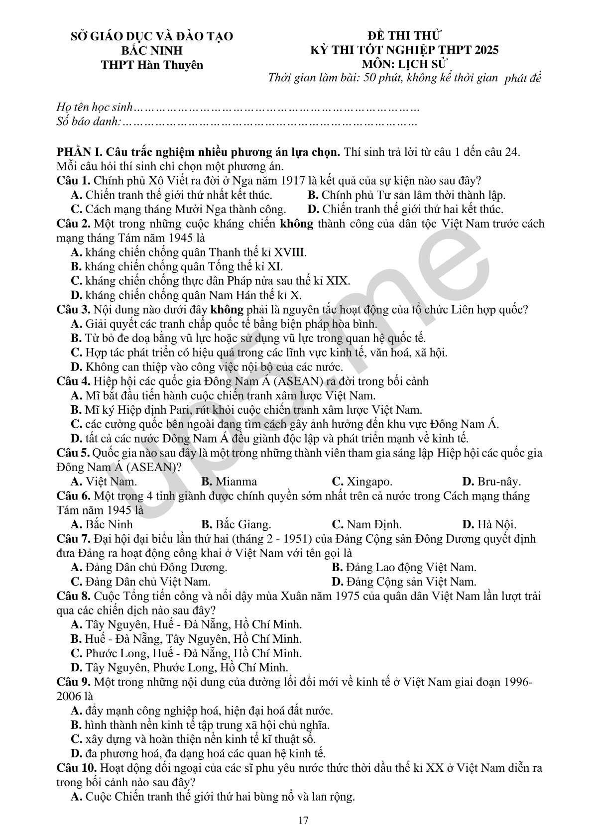 ĐỀ THI THỬKỲ THI TỐT NGHIỆP THPT 2025MÔN: LỊCH SỬThời gian làm bài: 50 phút, không kể thời gian phát đề |