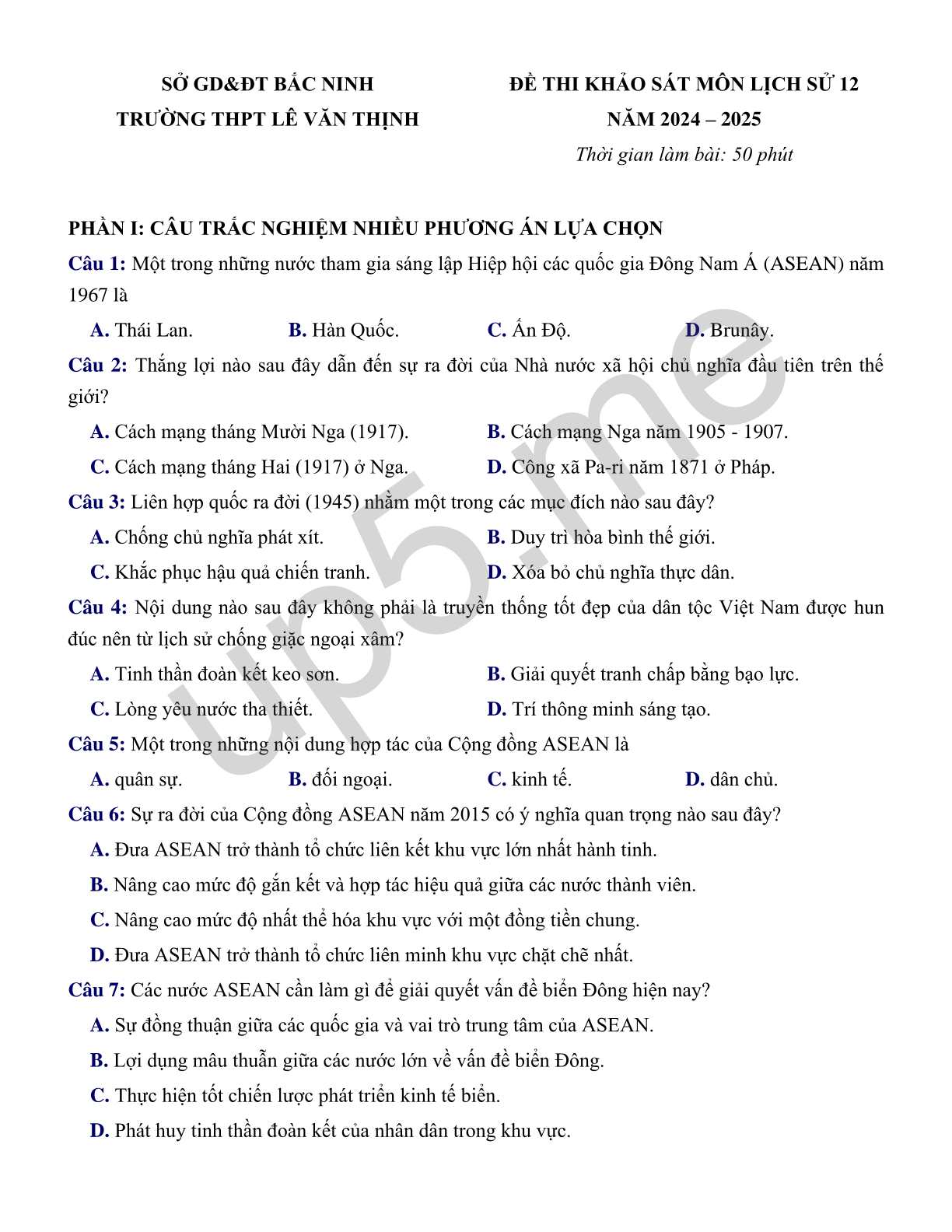 ĐỀ THI KHẢO SÁT MÔN LỊCH SỬ 12 NĂM 2024 – 2025 Thời gian làm bài: 50 phút |