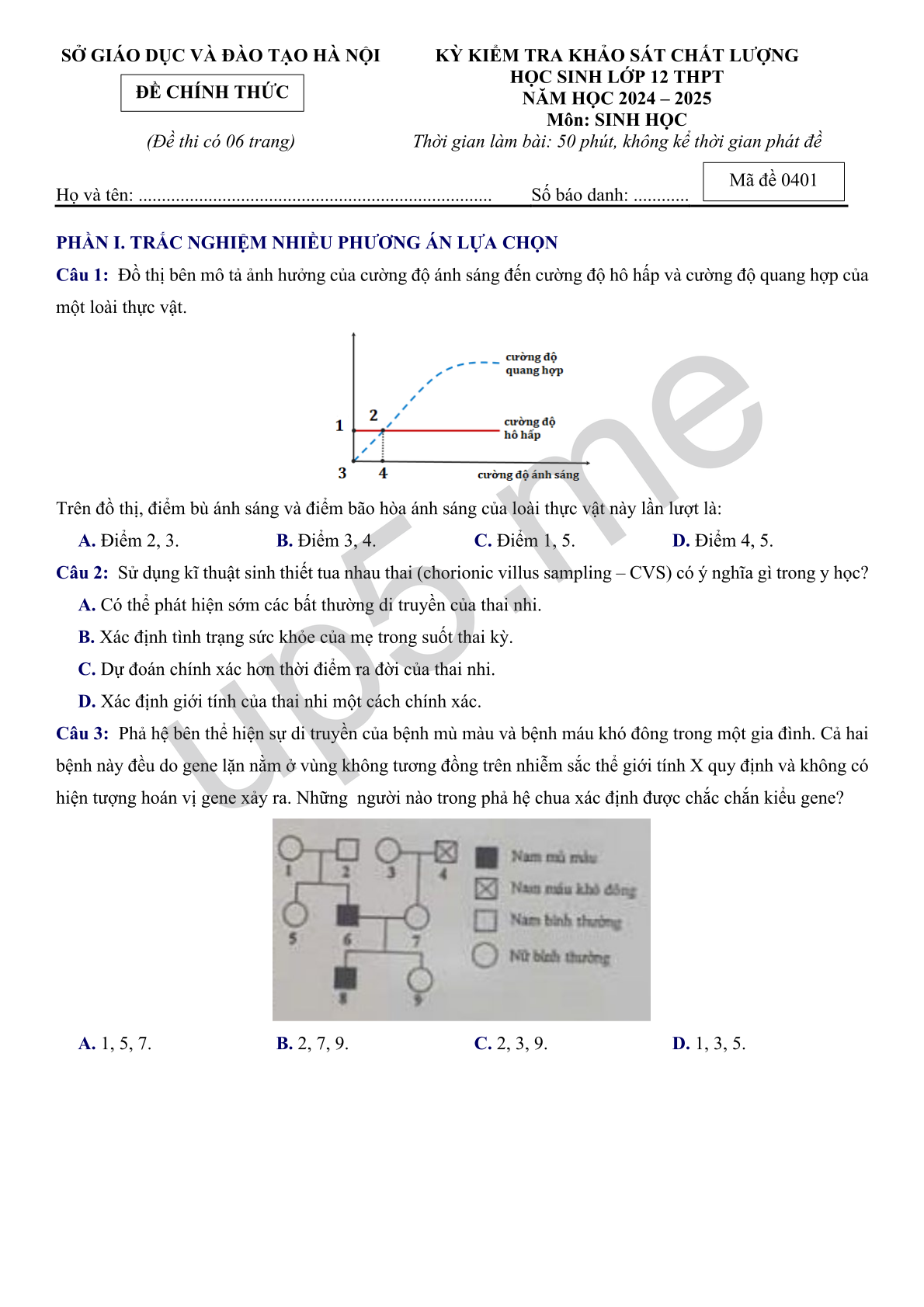KỲ KIỂM TRA KHẢO SÁT CHẤT LƯỢNGHỌC SINH LỚP 12 THPTNĂM HỌC 2024 – 2025Môn: SINH HỌC Thời gian làm bài: 50 phút, không kể thời gian phát đề |