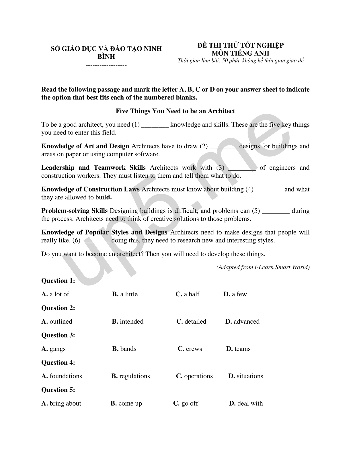 | SỞ GIÁO DỤC VÀ ĐÀO TẠO NINH BÌNH------------------ | ĐỀ THI THỬ TỐT NGHIỆP MÔN TIẾNG ANHThời gian làm bài: 50 phút, không kể thời gian giao đề |
