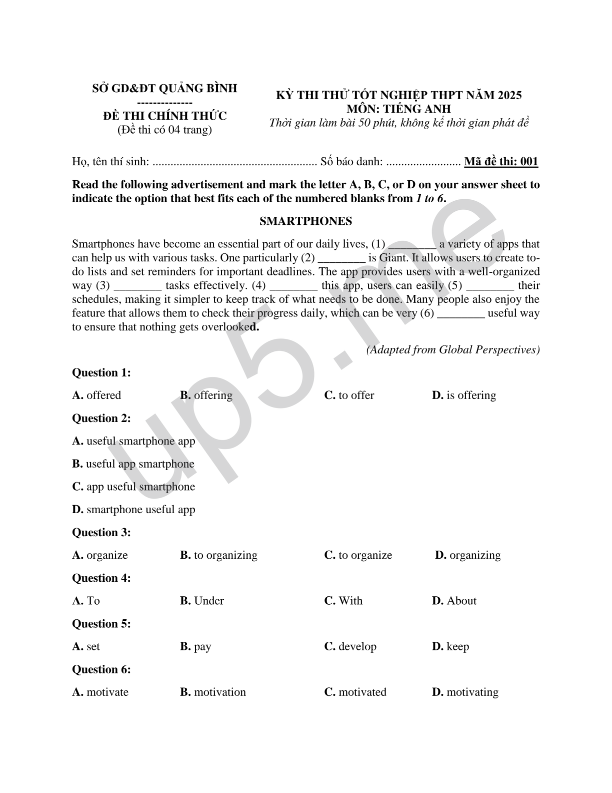 KỲ THI THỬ TỐT NGHIỆP THPT NĂM 2025 MÔN: TIẾNG ANH Thời gian làm bài 50 phút, không kể thời gian phát đề |