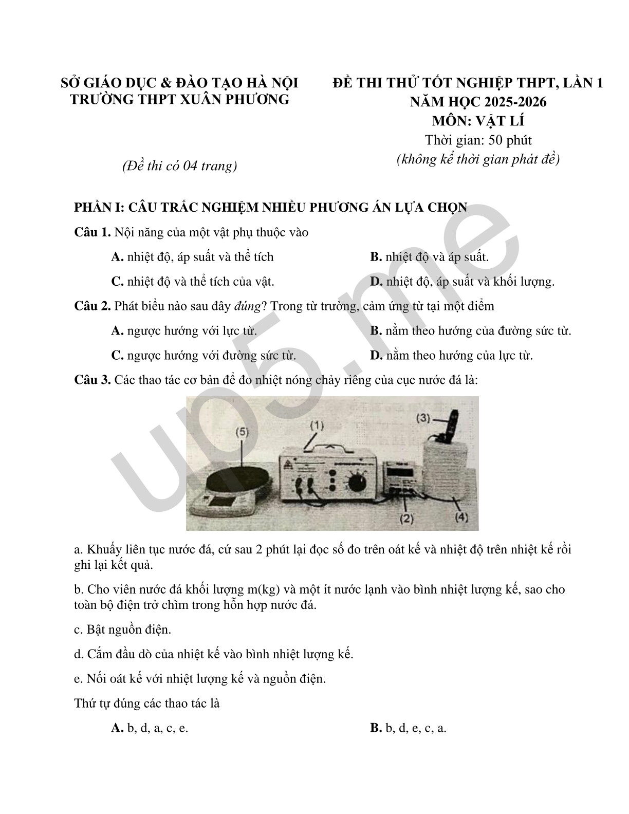ĐỀ THI THỬ TỐT NGHIỆP THPT, LẦN 1 NĂM HỌC 2025-2026 MÔN: VẬT LÍ Thời gian: 50 phút(không kể thời gian phát đề) |