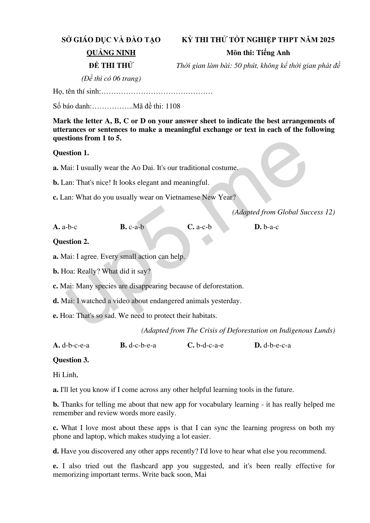 | SỞ GIÁO DỤC VÀ ĐÀO TẠOQUẢNG NINHĐỀ THI THỬ (Đề thi có 06 trang) | KỲ THI THỬ TỐT NGHIỆP THPT NĂM 2025Môn thi: Tiếng AnhThời gian làm bài: 50 phút, không kể thời gian phát đề |