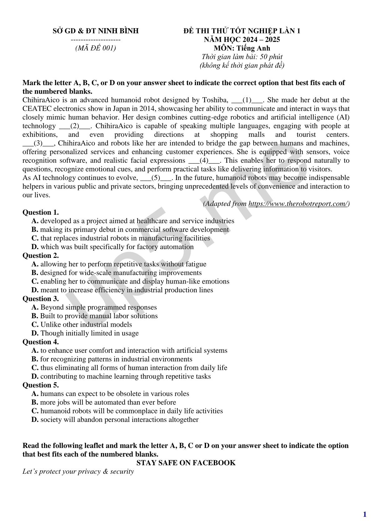 ĐỀ THI THỬ TỐT NGHIỆP LẦN 1NĂM HỌC 2024 – 2025 MÔN: Tiếng Anh Thời gian làm bài: 50 phút(không kể thời gian phát đề) |