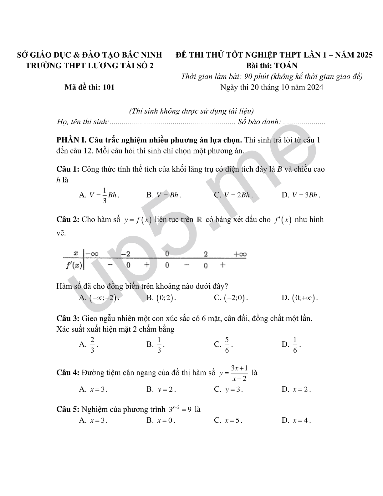 ĐỀ THI THỬ TỐT NGHIỆP THPT LẦN 1 – NĂM 2025 Bài thi: TOÁN Thời gian làm bài: 90 phút (không kể thời gian giao đề) Ngày thi 20 tháng 10 năm 2024 |