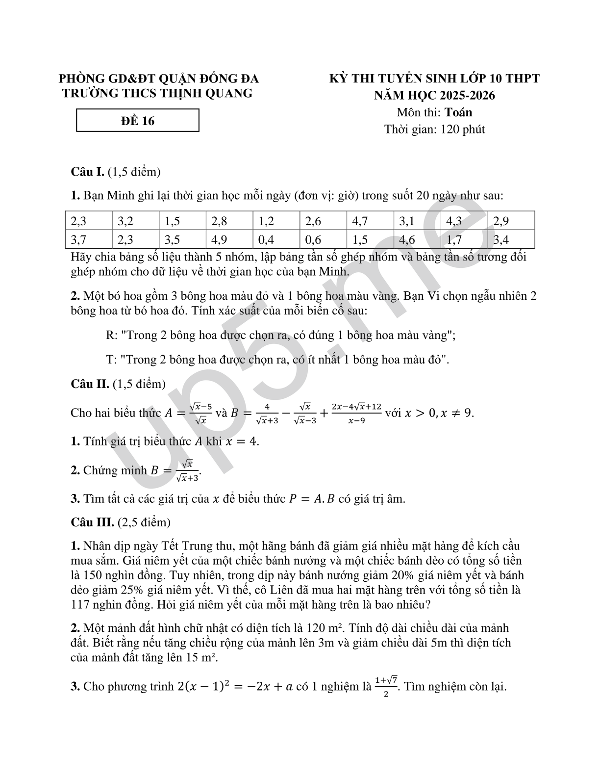 PHÒNG GD&ĐT QUẬN ĐỐNG ĐA TRƯỜNG THCS THỊNH QUANG ĐỀ 16