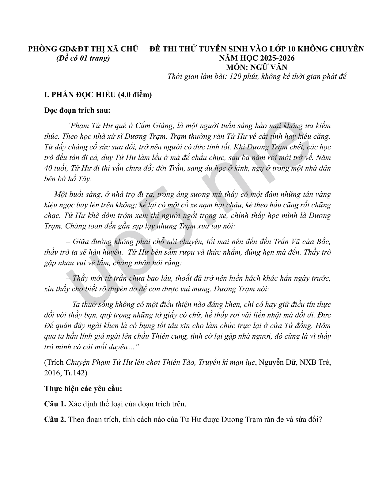 | PHÒNG GD&ĐT THỊ XÃ CHŨ(Đề có 01 trang) | ĐỀ THI THỬ TUYỂN SINH VÀO LỚP 10 KHÔNG CHUYÊNNĂM HỌC 2025-2026MÔN: NGỮ VĂNThời gian làm bài: 120 phút, không kể thời gian phát đề |