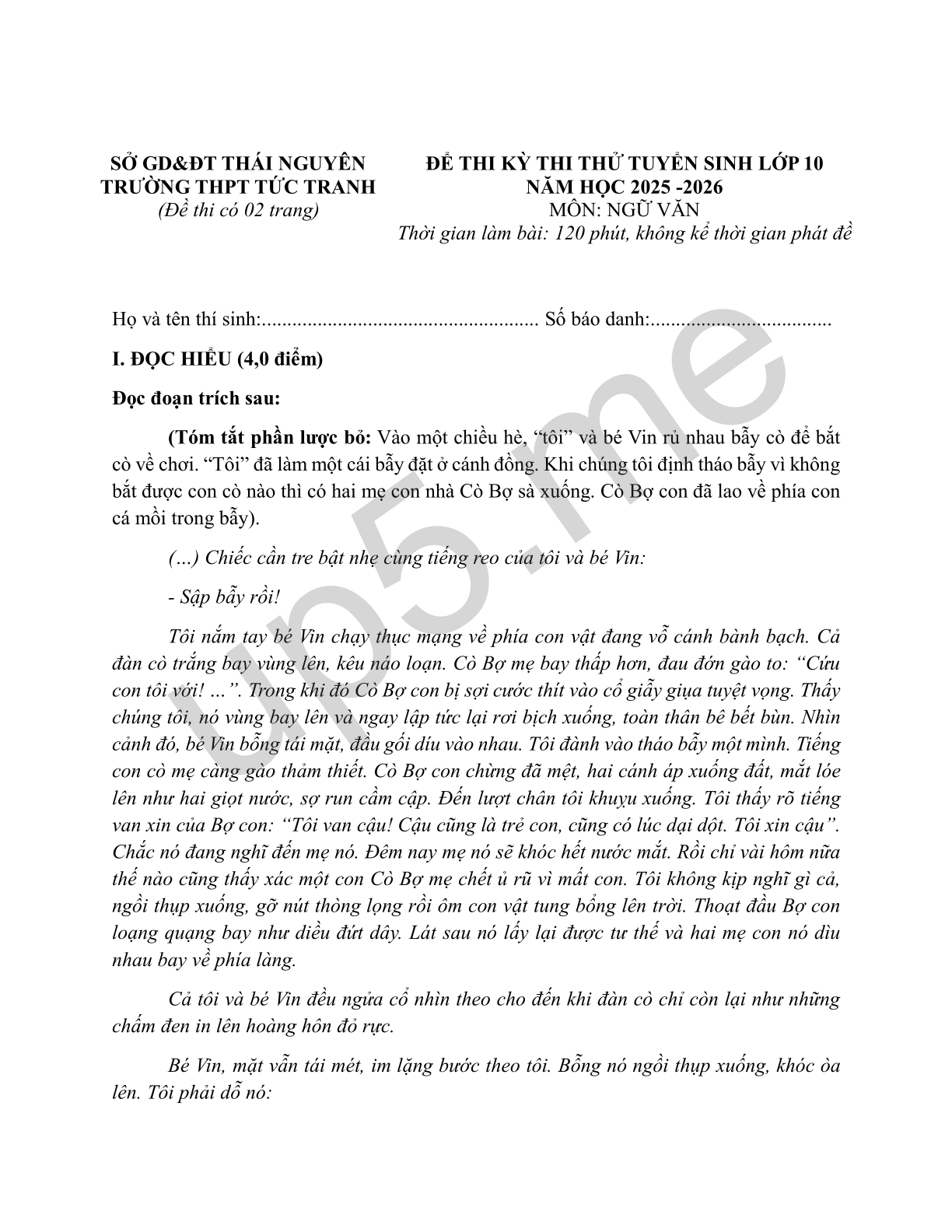 | SỞ GD&ĐT THÁI NGUYÊNTRƯỜNG THPT TỨC TRANH(Đề thi có 02 trang) | ĐỂ THI KỲ THI THỬ TUYỂN SINH LỚP 10NĂM HỌC 2025 -2026MÔN: NGỮ VĂNThời gian làm bài: 120 phút, không kể thời gian phát đề |