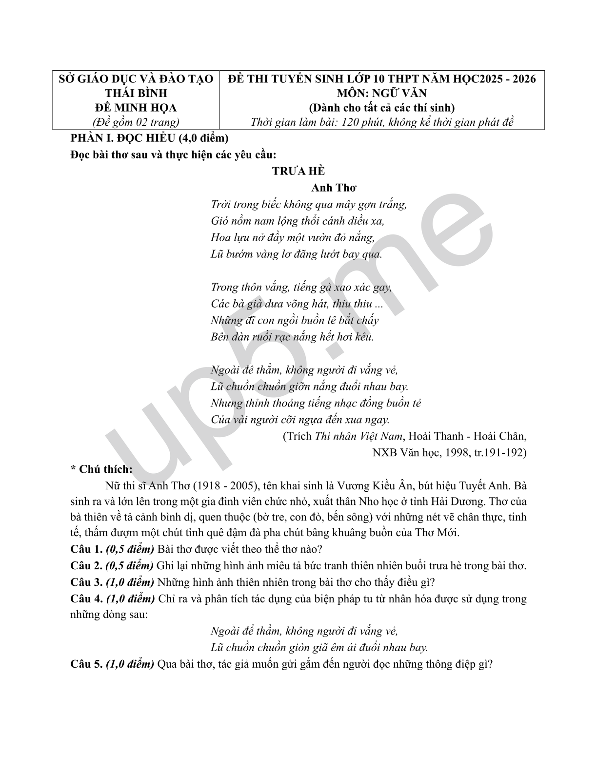 | SỞ GIÁO DỤC VÀ ĐÀO TẠOTHÁI BÌNHĐỀ MINH HỌA(Đề gồm 02 trang) | ĐỀ THI TUYỂN SINH LỚP 10 THPT NĂM HỌC2025 - 2026MÔN: NGỮ VĂN(Dành cho tất cả các thí sinh)Thời gian làm bài: 120 phút, không kể thời gian phát đề |