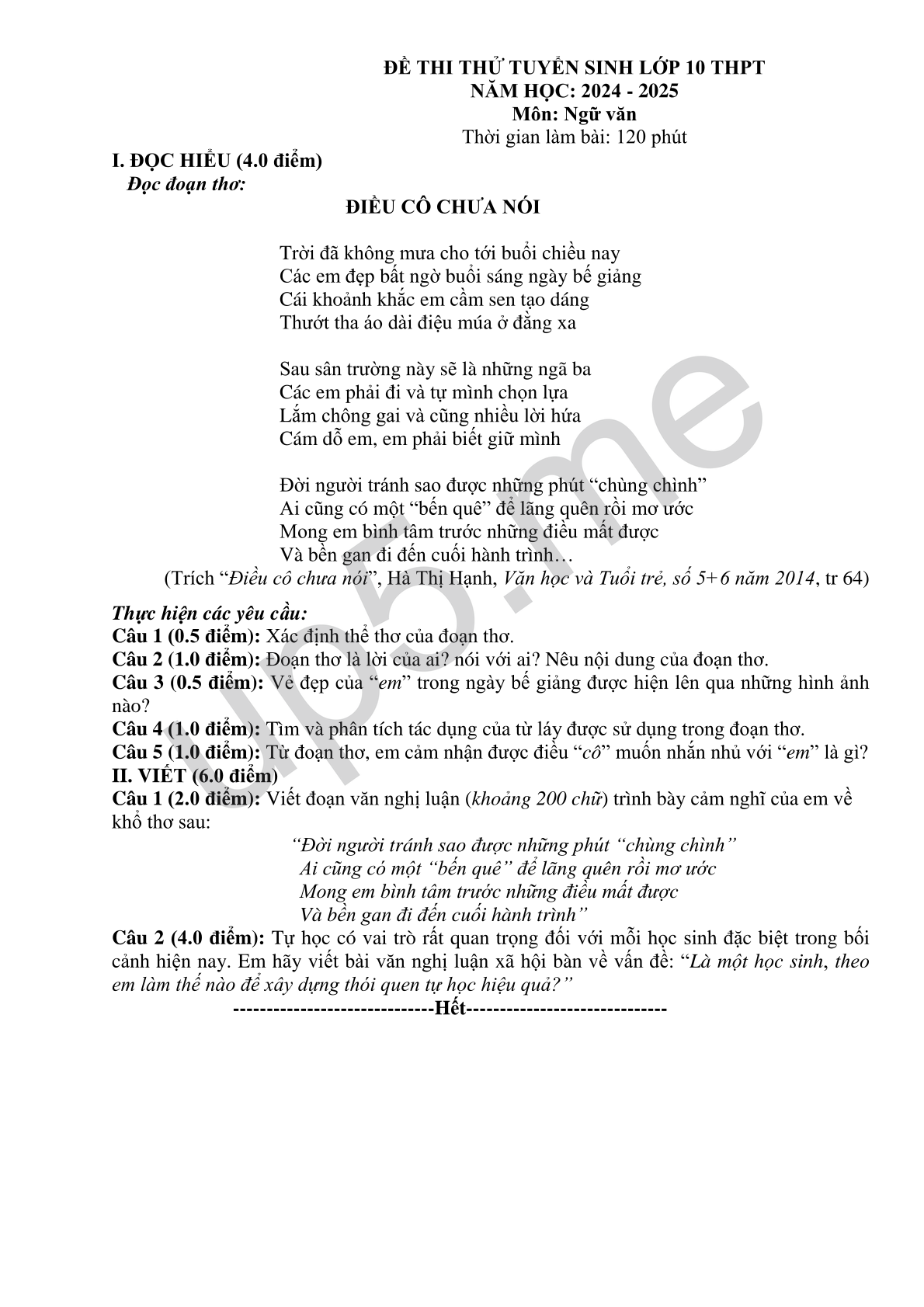 ĐỀ THI THỬ TUYỂN SINH LỚP 10 THPT