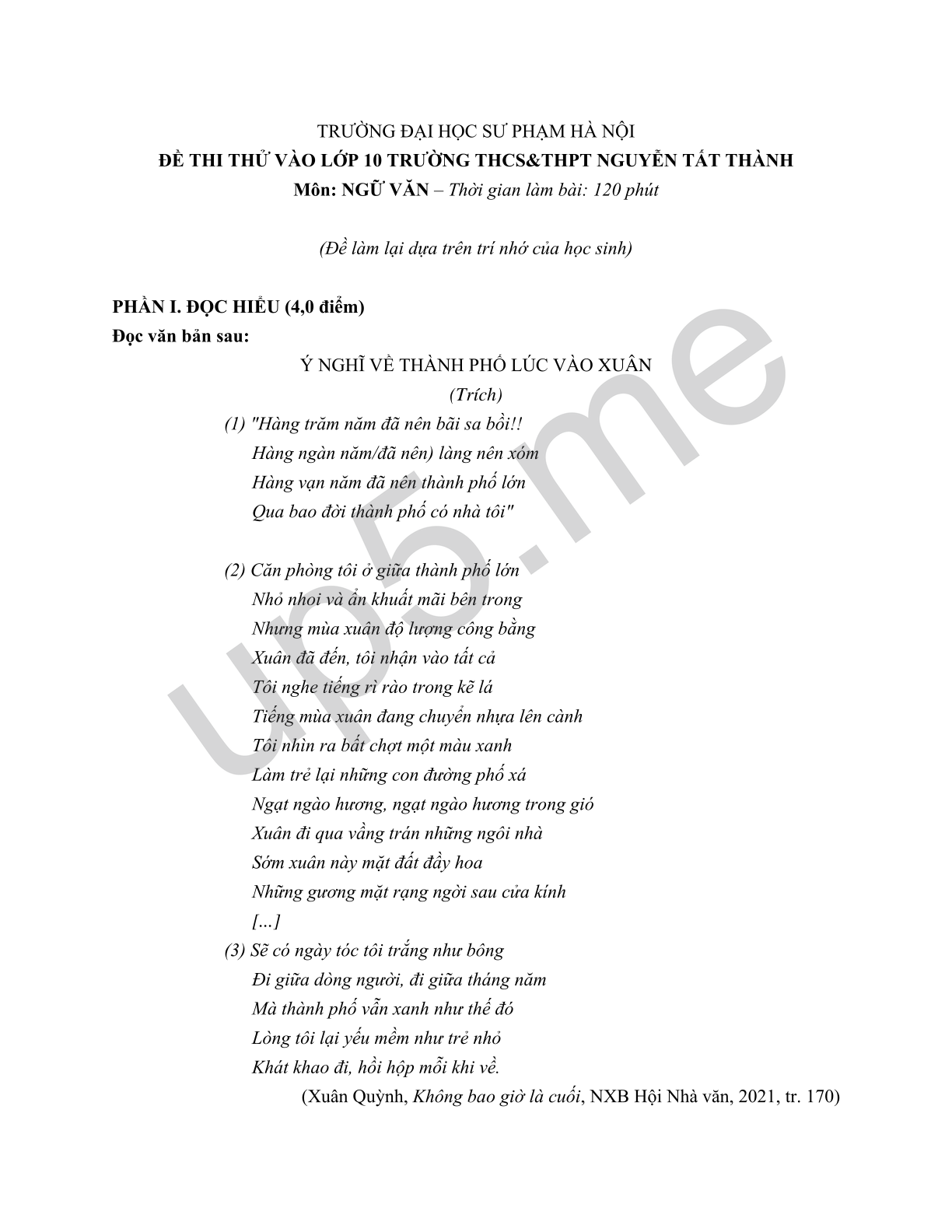 ĐỀ THI THỬ VÀO LỚP 10 TRƯỜNG THCS&THPT NGUYỄN TẤT THÀNH