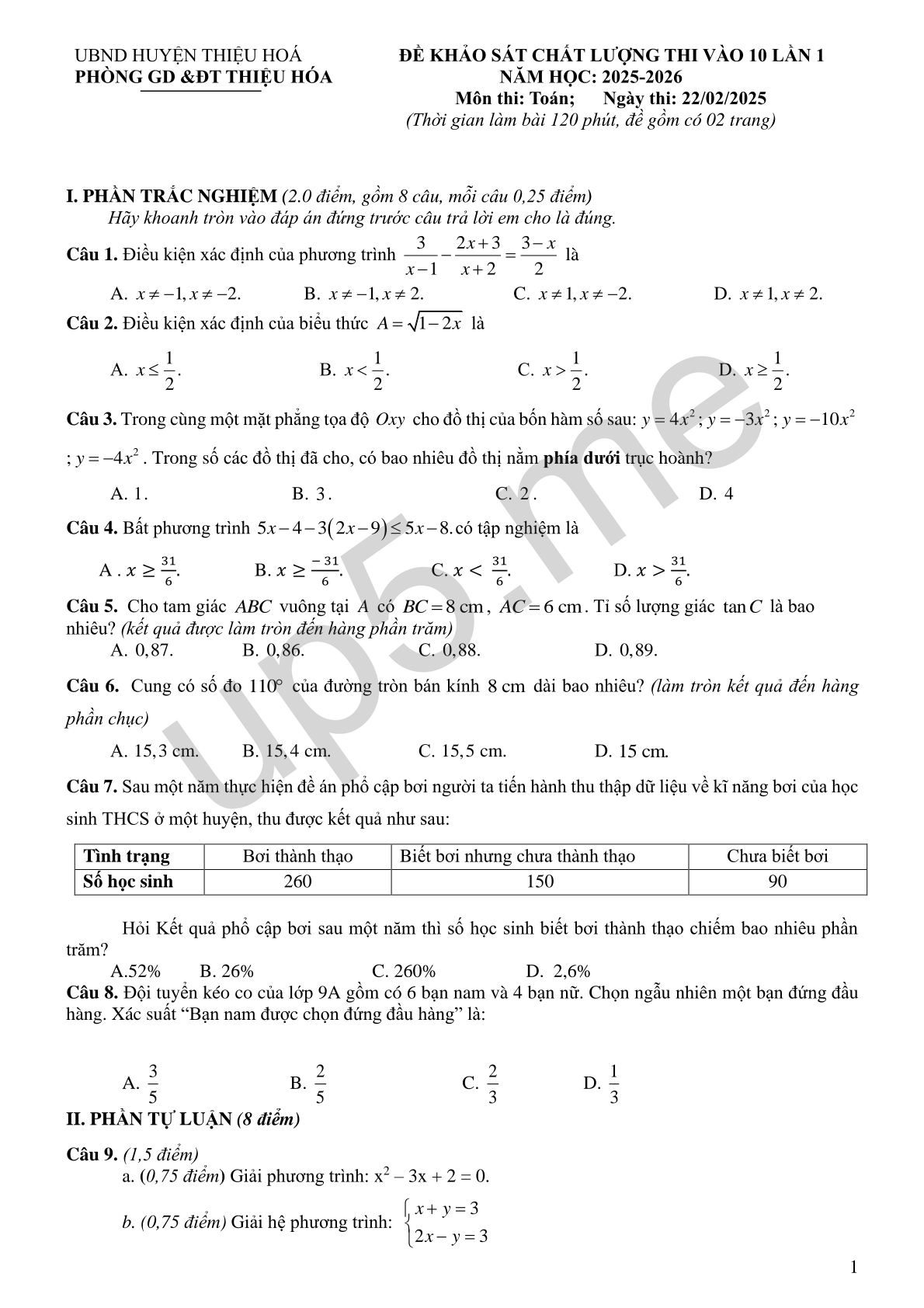 | UBND HUYỆN THIỆU HOÁPHÒNG GD &ĐT THIỆU HÓA | ĐỀ KHẢO SÁT CHẤT LƯỢNG THI VÀO 10 LẦN 1NĂM HỌC: 2025-2026Môn thi: Toán; Ngày thi: 22/02/2025(Thời gian làm bài 120 phút, đề gồm có 02 trang) |