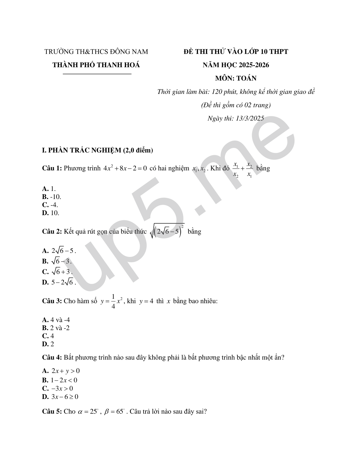 | TRƯỜNG TH&THCS ĐÔNG NAMTHÀNH PHỐ THANH HOÁ | ĐỀ THI THỬ VÀO LỚP 10 THPTNĂM HỌC 2025-2026MÔN: TOÁNThời gian làm bài: 120 phút, không kể thời gian giao đề(Đề thi gồm có 02 trang)Ngày thi: 13/3/2025 |