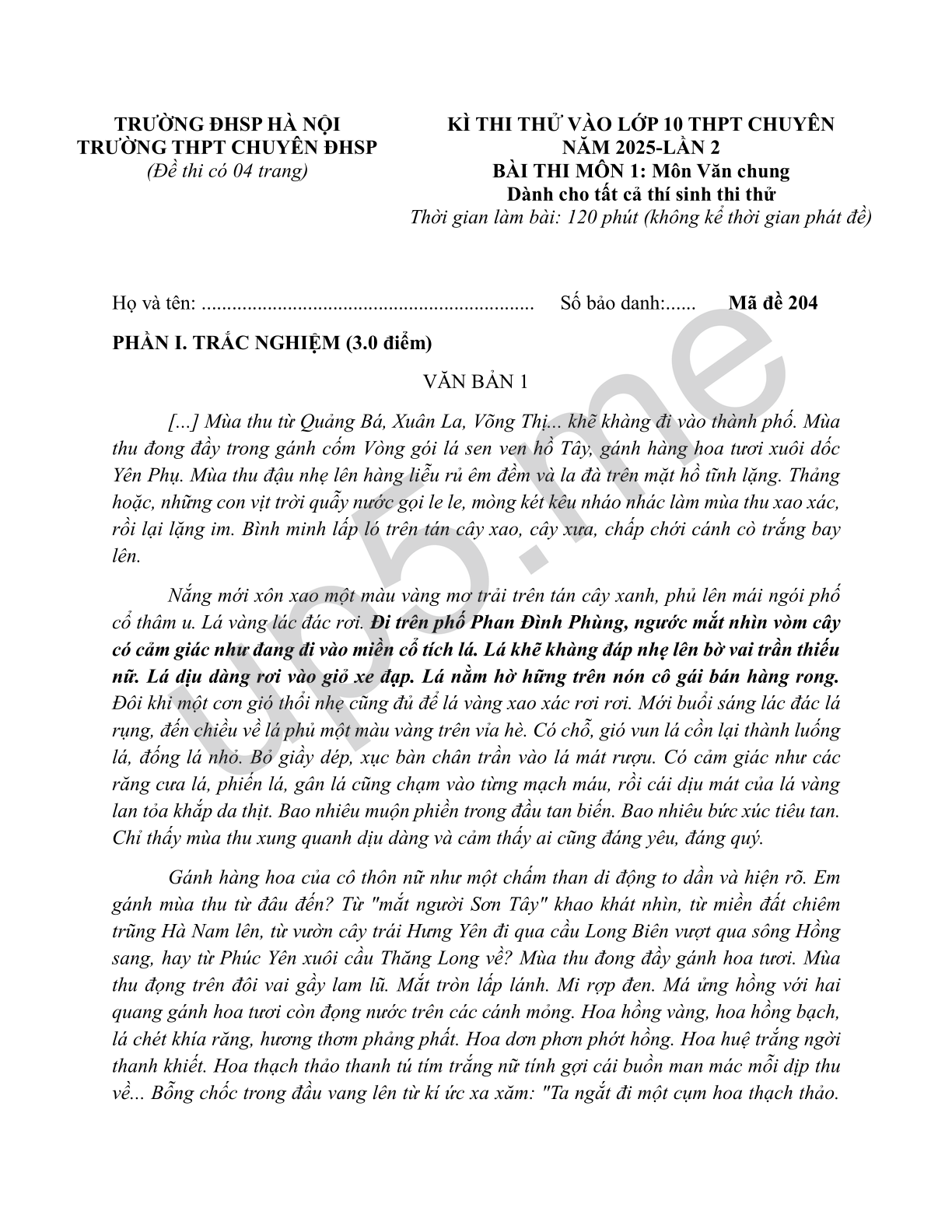 | TRƯỜNG ĐHSP HÀ NỘITRƯỜNG THPT CHUYÊN ĐHSP(Đề thi có 04 trang) | KÌ THI THỬ VÀO LỚP 10 THPT CHUYÊNNĂM 2025-LẦN 2BÀI THI MÔN 1: Môn Văn chungDành cho tất cả thí sinh thi thửThời gian làm bài: 120 phút (không kể thời gian phát đề) |