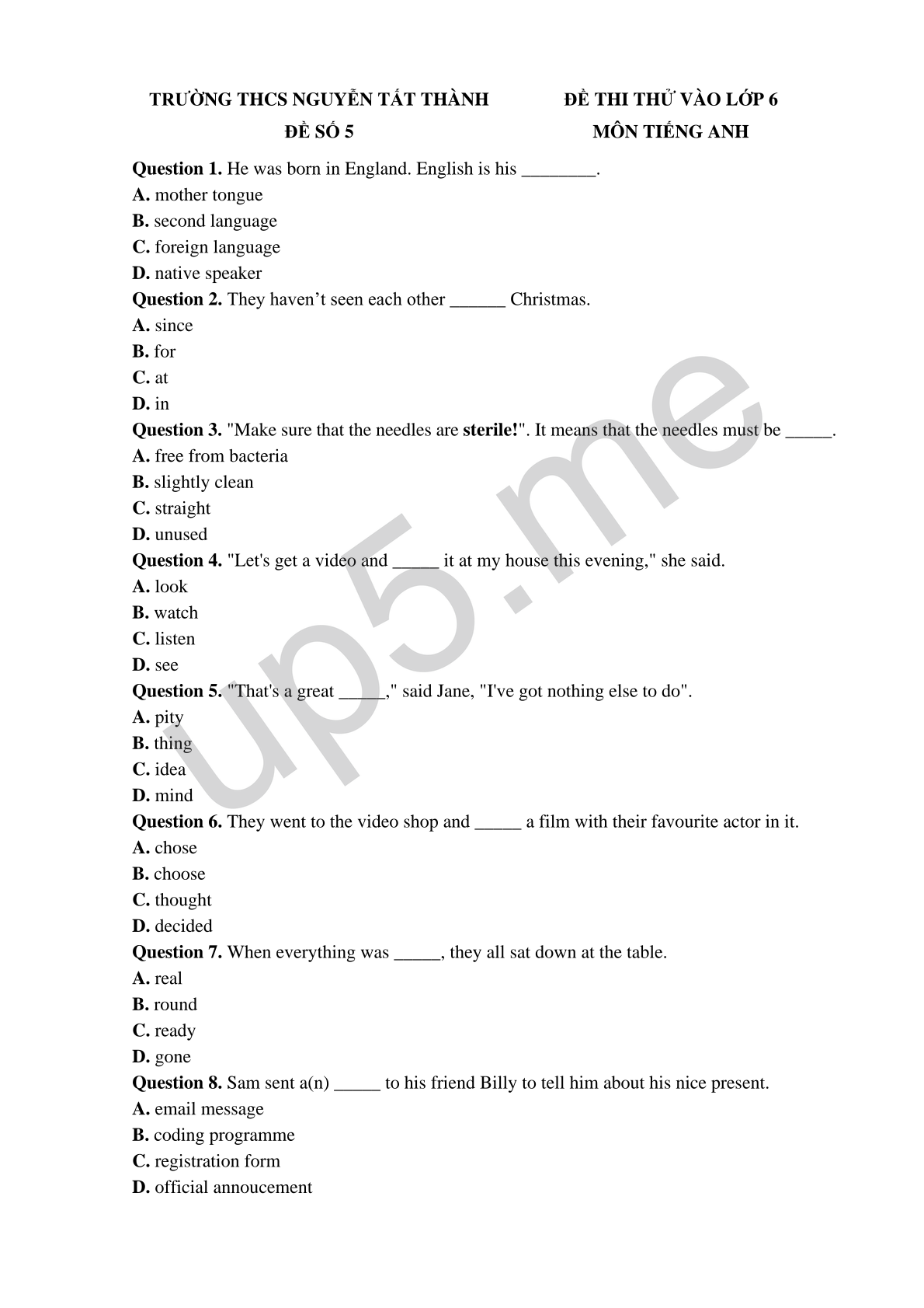 | TRƯỜNG THCS NGUYỄN TẤT THÀNHĐỀ SỐ 5 | ĐỀ THI THỬ VÀO LỚP 6MÔN TIẾNG ANH |