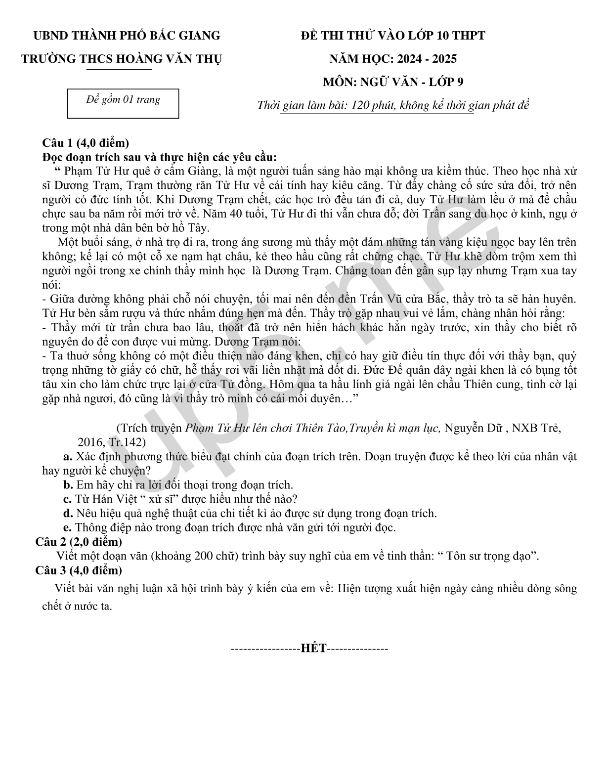 ĐỀ THI THỬ VÀO LỚP 10 THPT NĂM HỌC: 2024 - 2025 MÔN: NGỮ VĂN - LỚP 9 Thời gian làm bài: 120 phút, không kể thời gian phát đề |