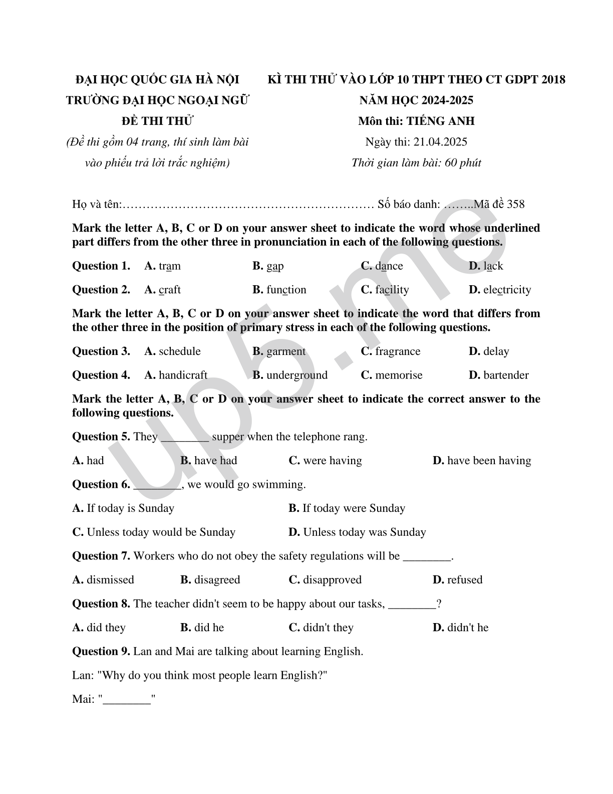 | ĐẠI HỌC QUỐC GIA HÀ NỘITRƯỜNG ĐẠI HỌC NGOẠI NGỮĐỀ THI THỬ(Đề thi gồm 04 trang, thí sinh làm bài vào phiếu trả lời trắc nghiệm) | KÌ THI THỬ VÀO LỚP 10 THPT THEO CT GDPT 2018NĂM HỌC 2024-2025Môn thi: TIẾNG ANHNgày thi: 21.04.2025Thời gian làm bài: 60 phút |