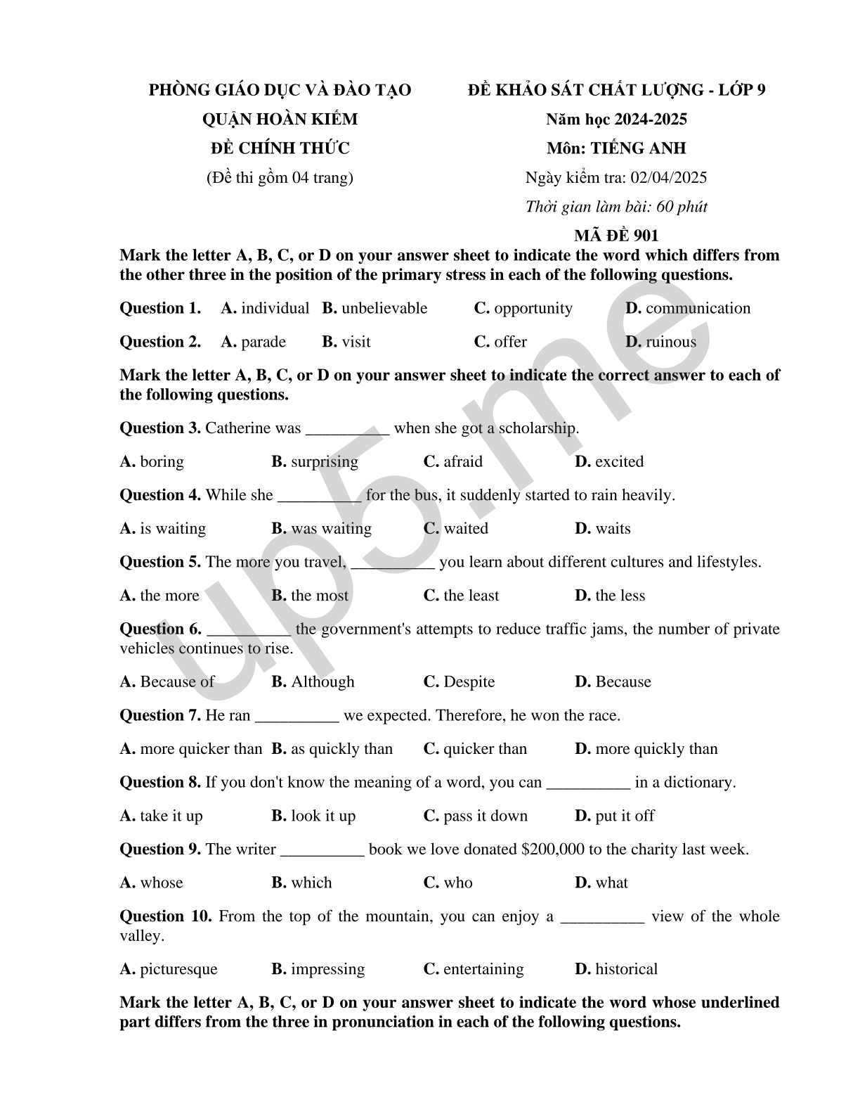 | PHÒNG GIÁO DỤC VÀ ĐÀO TẠOQUẬN HOÀN KIẾMĐỀ CHÍNH THỨC(Đề thi gồm 04 trang) | ĐỀ KHẢO SÁT CHẤT LƯỢNG - LỚP 9Năm học 2024-2025Môn: TIẾNG ANHNgày kiểm tra: 02/04/2025Thời gian làm bài: 60 phútMÃ ĐỀ 901 |