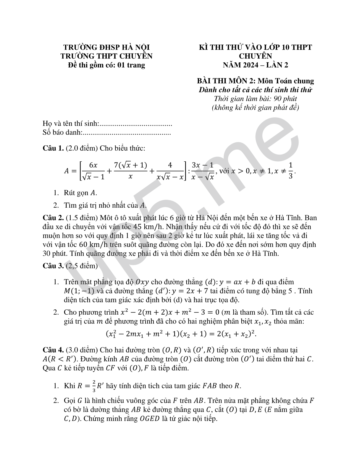 Câu 2. (1.5 điểm) Môt ô tô xuất phát lúc 6 giờ từ Hả Nội đến một bến xe ở Hà Tĩnh. Ban đầu xe di chuyển vởi vận tốc $45km/h$. Nhận thấy nếu cứ đi với tốc độ đó thì xe sẽ đến muộn hơn so với quy định 1 giờ nên sau 2 giờ ké̉ tư lúc xuất phát, lái xe tăng tốc vả đi với vận tốc $60km/h$ trên suôt quãng đường còn lại. Do đó xe đến nơi sớm hơn quy định 30 phút. Tính quãng đường xe phȧi đi và thời điểm xe đến bến xe ở Hà Tīnh.