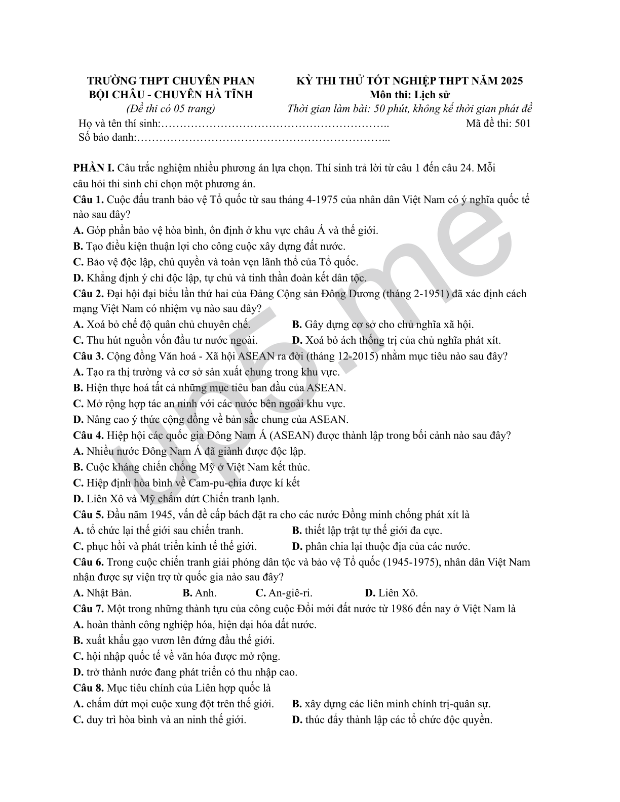 KỲ THI THỬ TỐT NGHIỆP THPT NĂM 2025 Môn thi: Lịch sử Thời gian làm bài: 50 phút, không kể thời gian phát đề |