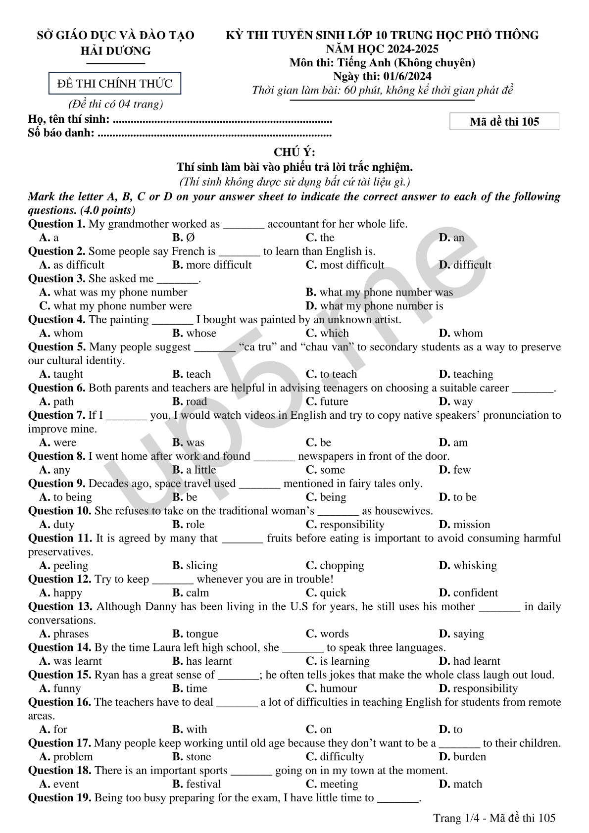 SỞ GIÁO DỤC VÀ ĐÀO TẠO HẢI DƯƠNG ĐỀ THI CHÍNH THỨC (Đề thi có 04 trang) |