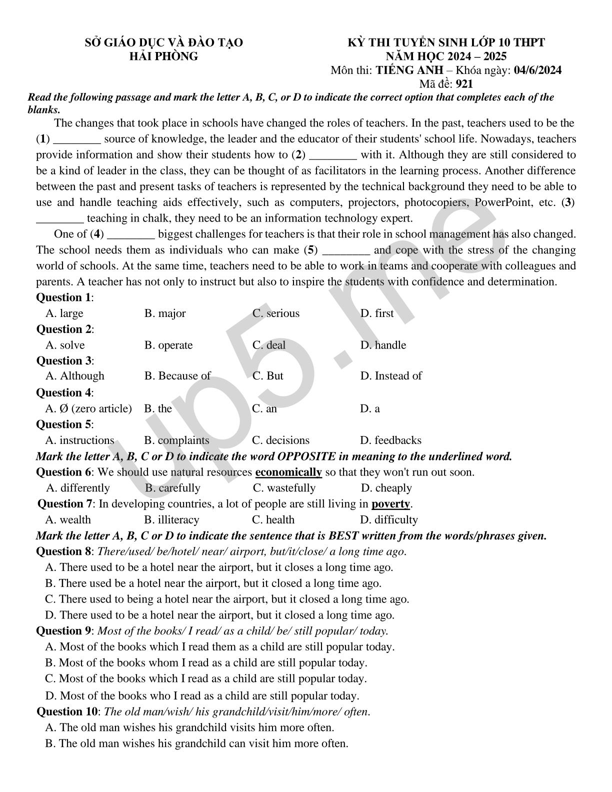 | SỞ GIÁO DỤC VÀ ĐÀO TẠOHẢI PHÒNG | KỲ THI TUYỂN SINH LỚP 10 THPTNĂM HỌC 2024 – 2025Môn thi: TIẾNG ANH – Khóa ngày: 04/6/2024Mã đề: 921 |