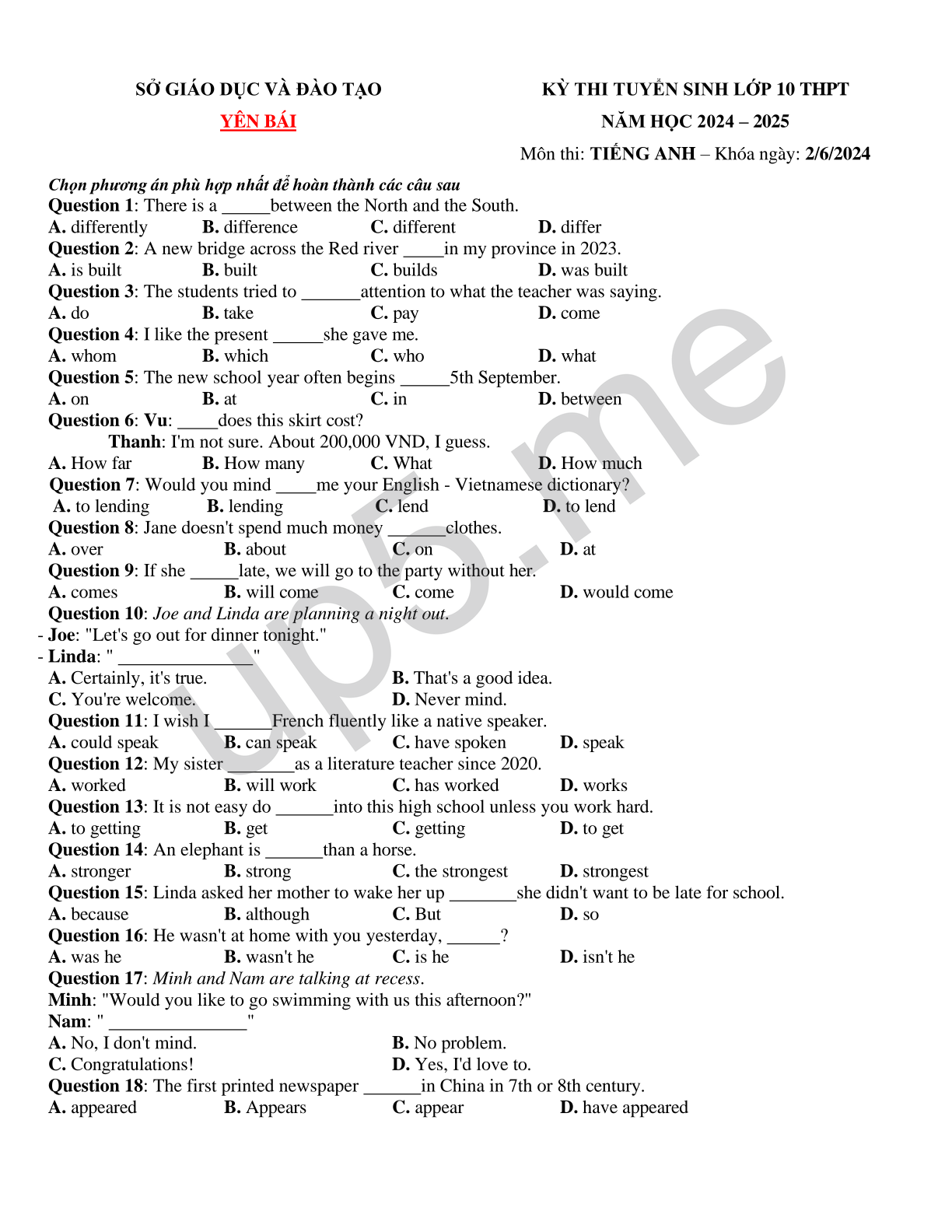 | SỞ GIÁO DỤC VÀ ĐÀO TẠOYÊN BÁI | KỲ THI TUYỂN SINH LỚP 10 THPTNĂM HỌC 2024 – 2025Môn thi: TIẾNG ANH – Khóa ngày: 2/6/2024 |
