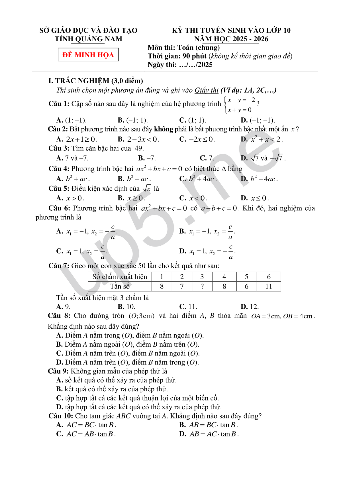 I. TRẮC NGHIỆM (3,0 điểm)