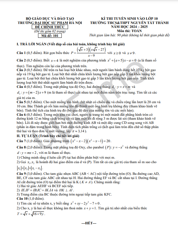 KÌ THI TUYỂN SINH VÀO LỚP 10TRƯỜNG THCS&THPT NGUYỄN TẤT THÀNH NĂM HỌC 2024 – 2025 Môn thi: TOÁN Thời gian làm bài: 90 phút (không kể thời gian phát đề) |