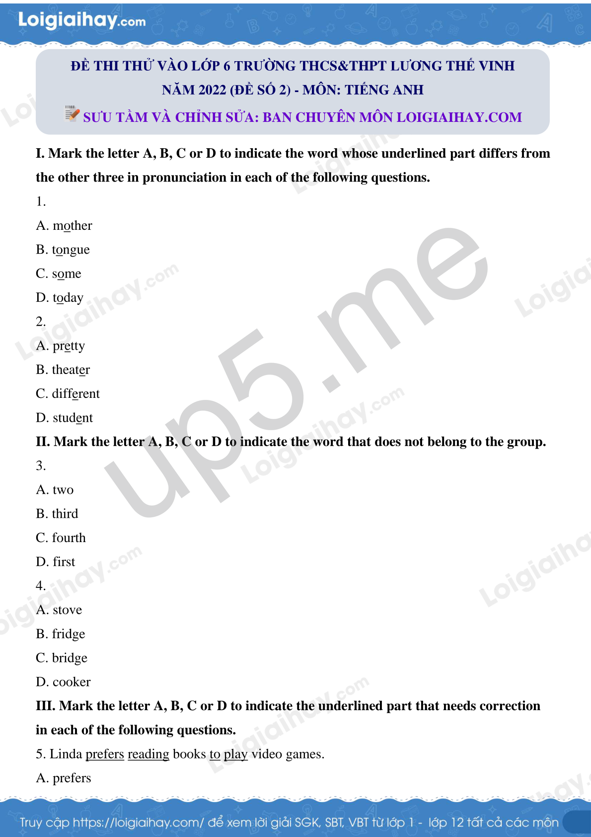 ĐỀ THI THỬ VÀO LỚP 6 TRƯỜNG THCS&THPT LƯƠNG THẾ VINH