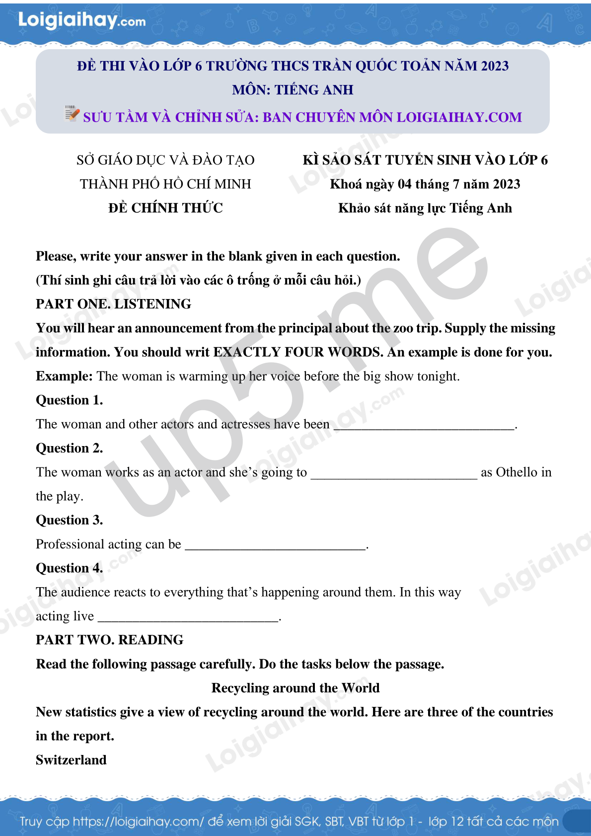 | SỞ GIÁO DỤC VÀ ĐÀO TẠOTHÀNH PHỐ HỒ CHÍ MINHĐỀ CHÍNH THỨC | KÌ SẢO SÁT TUYỂN SINH VÀO LỚP 6Khoá ngày 04 tháng 7 năm 2023Khảo sát năng lực Tiếng Anh |
