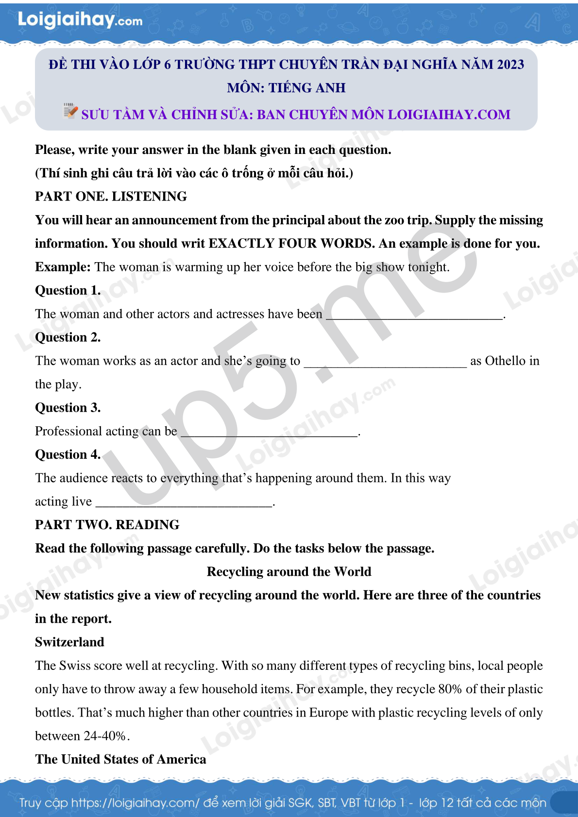 ĐỀ THI VÀO LỚP 6 TRƯỜNG THPT CHUYÊN TRẦN ĐẠI NGHĨA NĂM 2023
