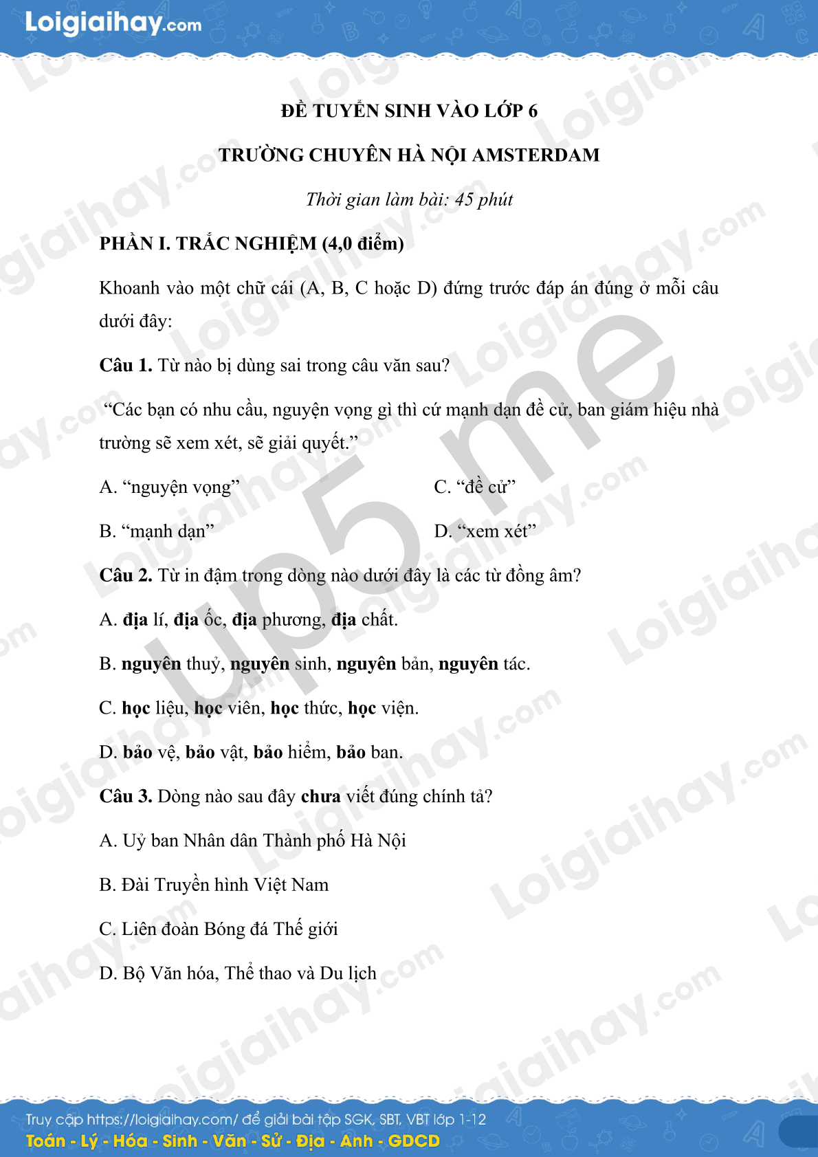 ĐỀ TUYỂN SINH VÀO LỚP 6
