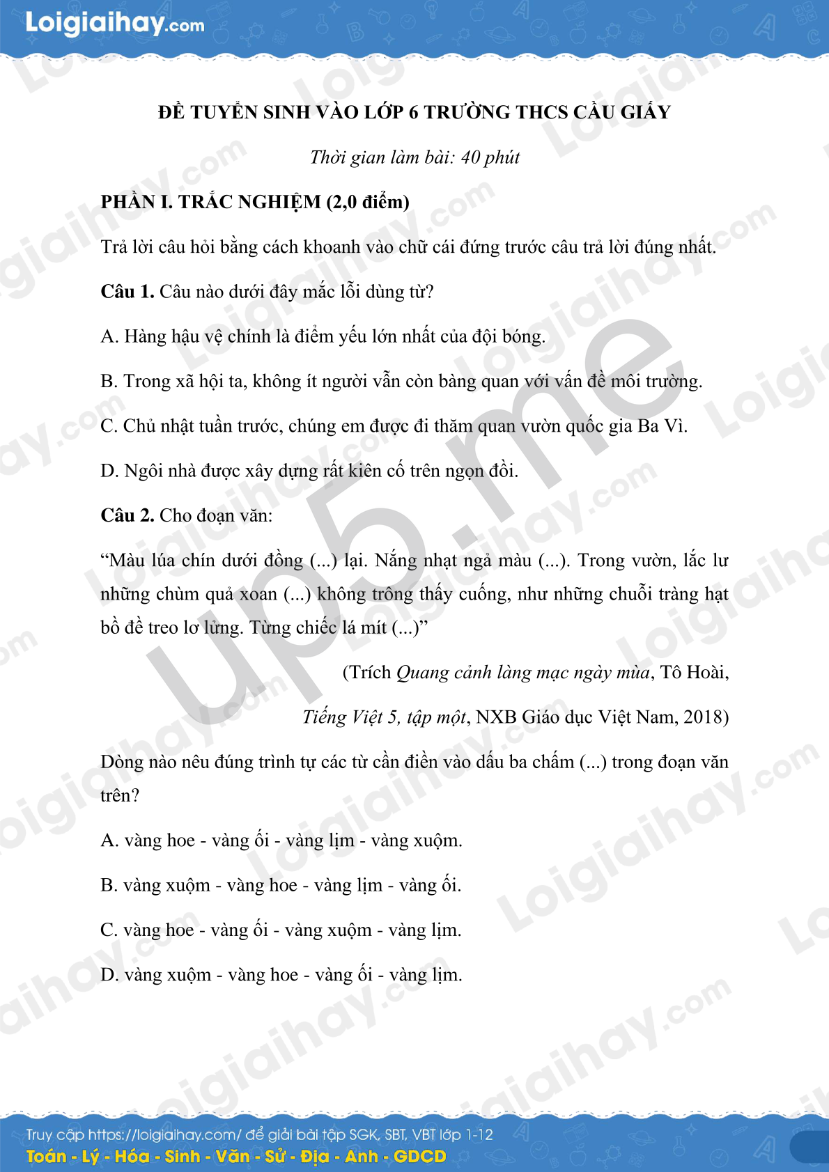 ĐỀ TUYỂN SINH VÀO LỚP 6 TRƯỜNG THCS CẦU GIẤY