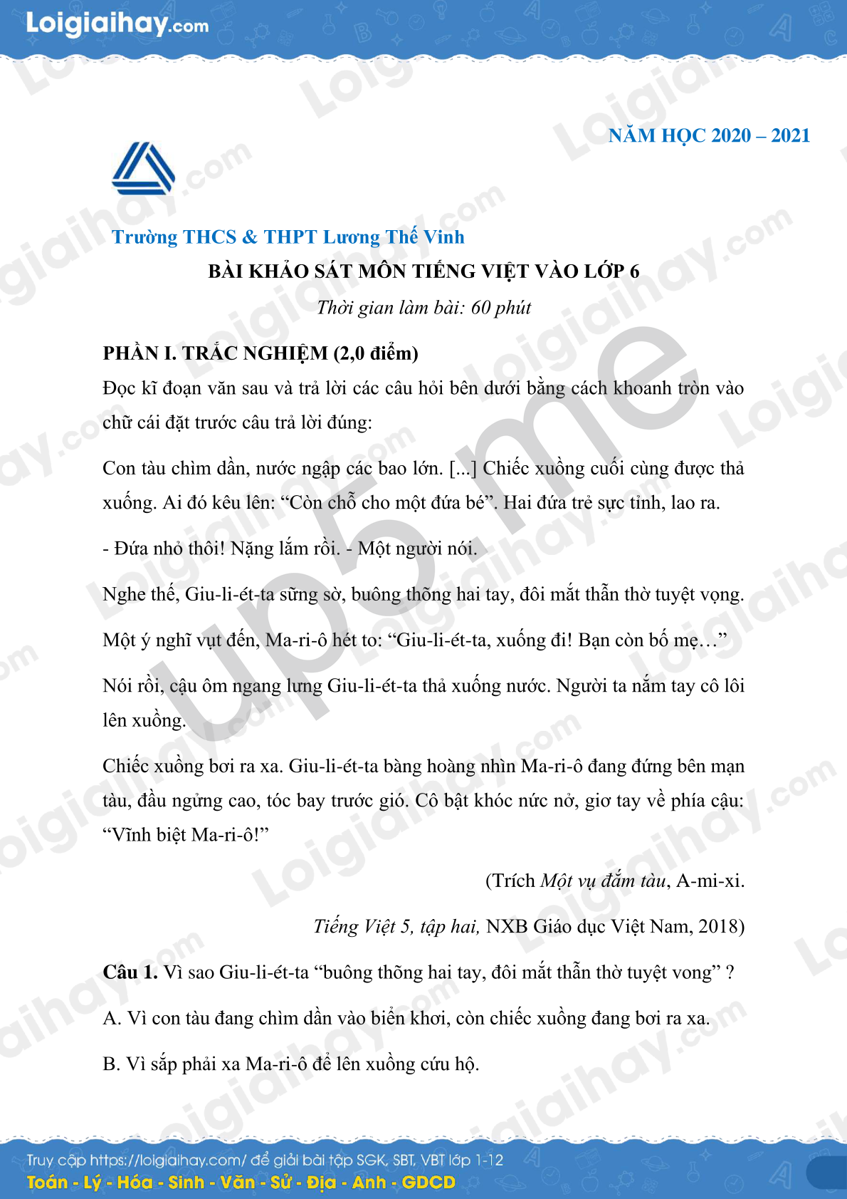 BÀI KHẢO SÁT MÔN TIẾNG VIỆT VÀO LỚP 6