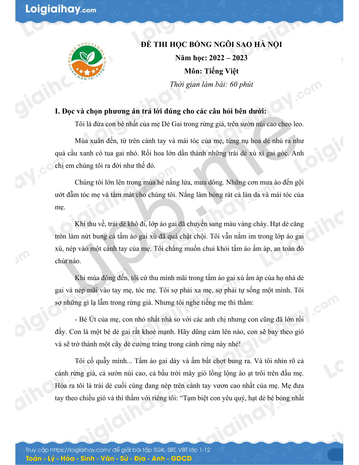 ![]() | ĐỀ THI HỌC BỔNG NGÔI SAO HÀ NỘINăm học: 2022 – 2023Môn: Tiếng ViệtThời gian làm bài: 60 phút |