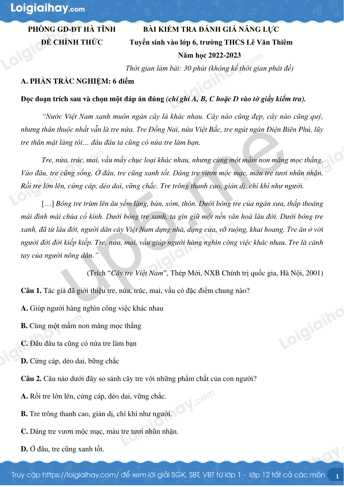 | PHÒNG GD-ĐT HÀ TĨNHĐỀ CHÍNH THỨC | BÀI KIỂM TRA ĐÁNH GIÁ NĂNG LỰCTuyển sinh vào lớp 6, trường THCS Lê Văn ThiêmNăm học 2022-2023Thời gian làm bài: 30 phút (không kể thời gian phát đề) |