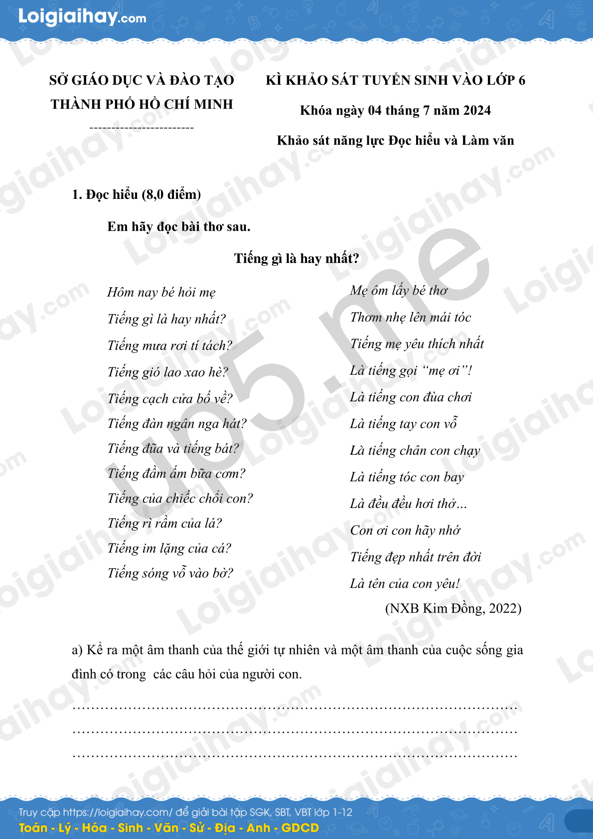 | SỞ GIÁO DỤC VÀ ĐÀO TẠOTHÀNH PHỐ HỒ CHÍ MINH ------------------------ | KÌ KHẢO SÁT TUYỂN SINH VÀO LỚP 6Khóa ngày 04 tháng 7 năm 2023Khảo sát năng lực Đọc hiểu và Làm văn |