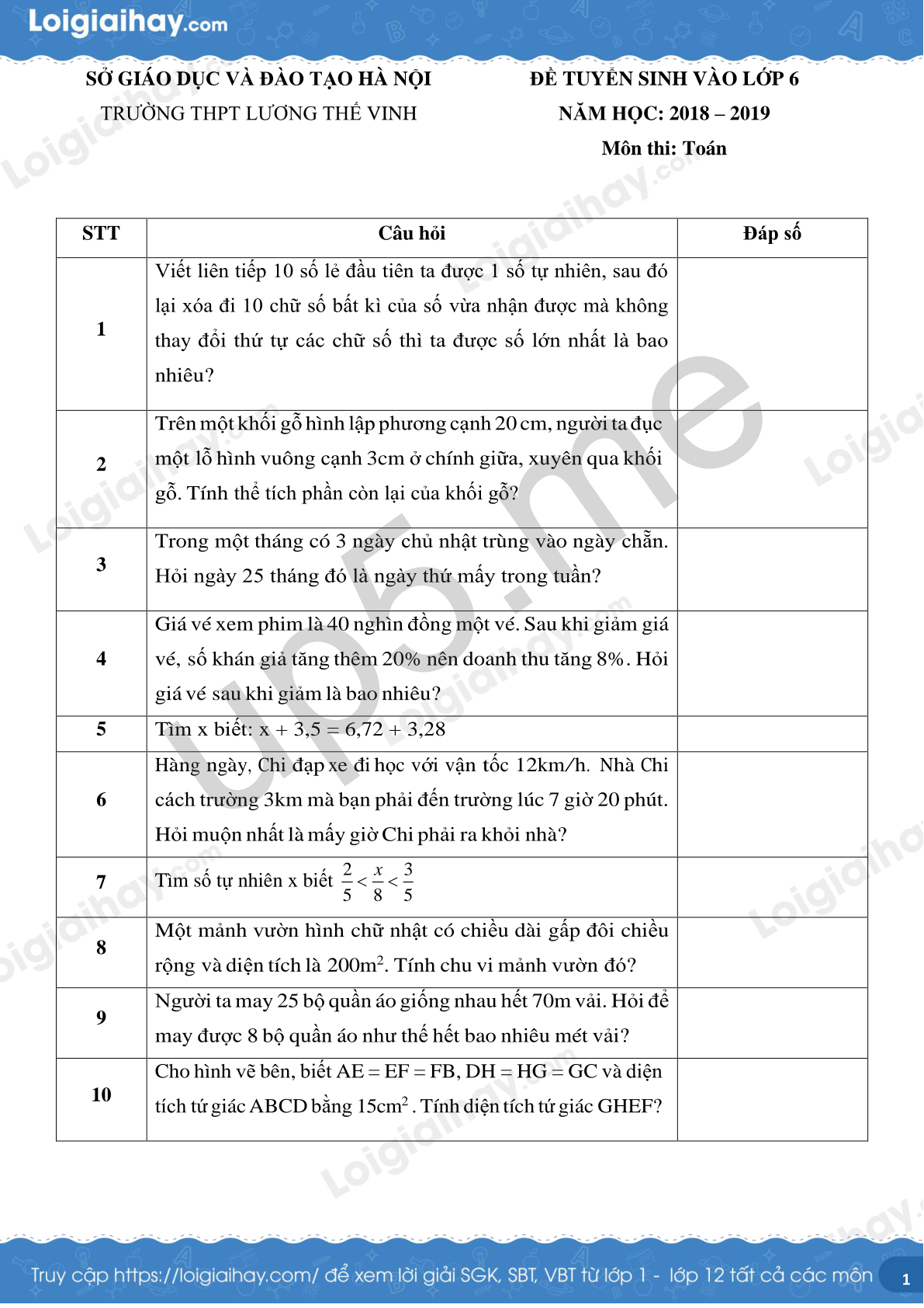Đề thi vào lớp 6 môn Toán năm 2018 - 2019 trường THCS & THPT Lương Thế Vinh