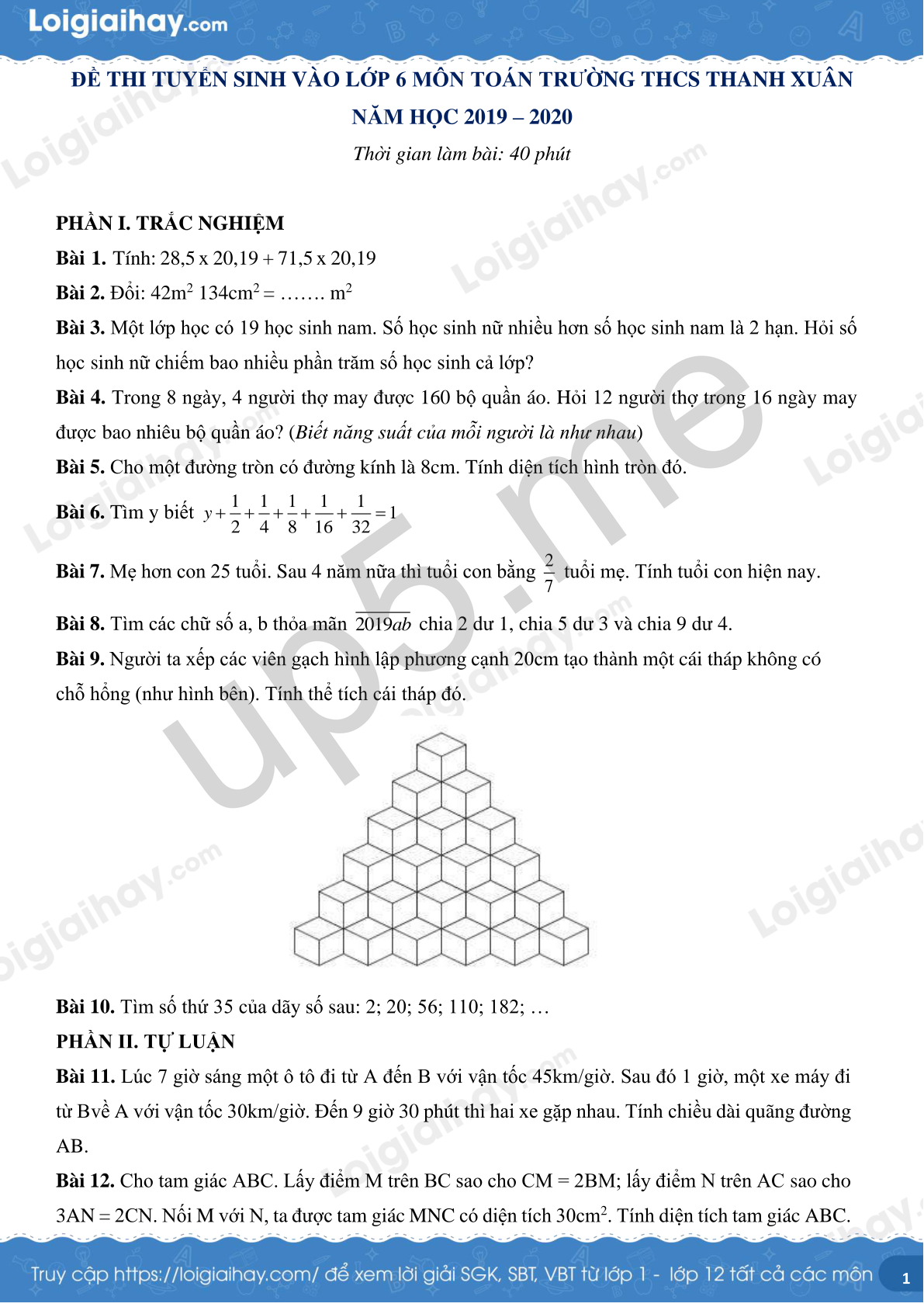 ĐỀ THI TUYỂN SINH VÀO LỚP 6 MÔN TOÁN TRƯỜNG THCS THANH XUÂN